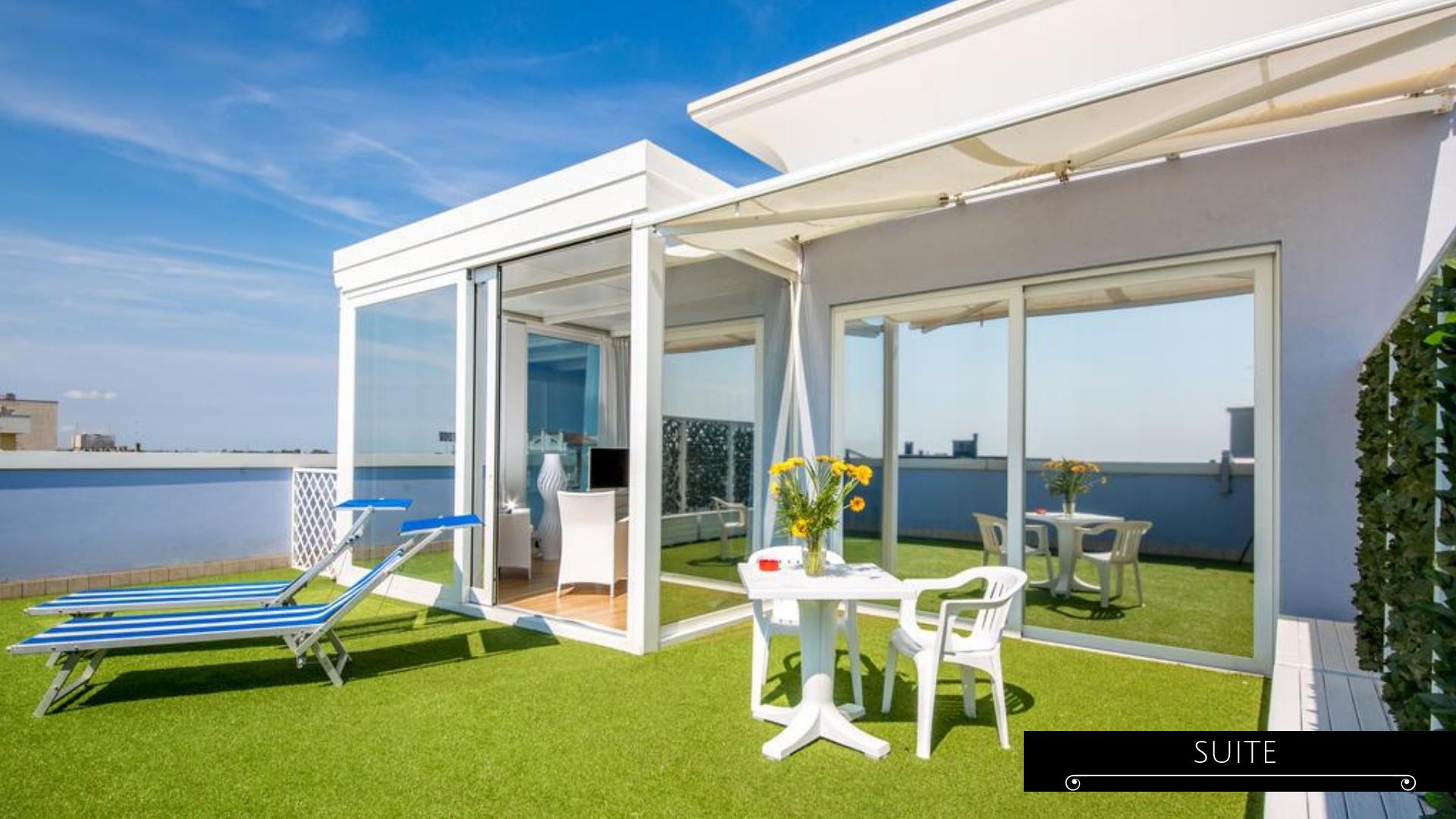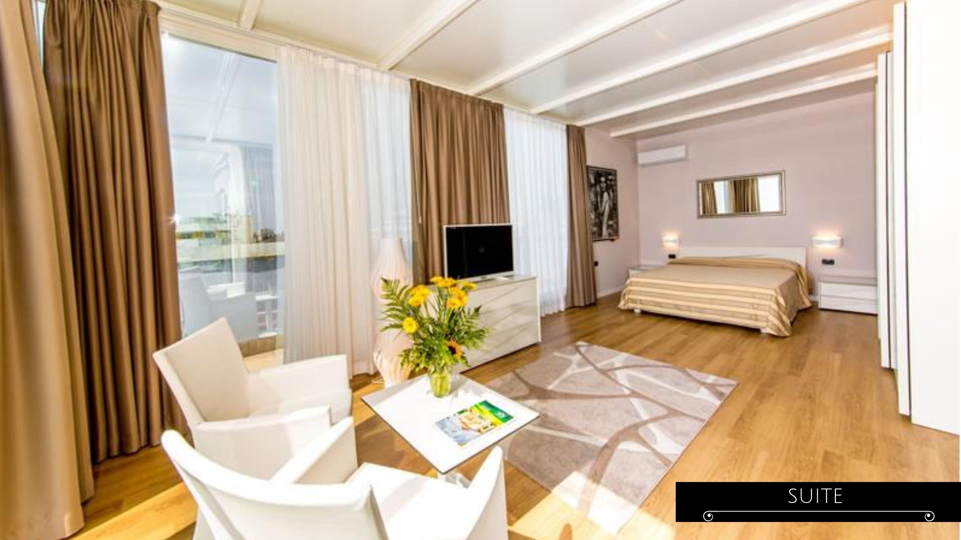 JUNIOR SUITE max occupancy 2 pax+culla: Camera matrimoniale con salotto e 2 balconi e vista mare laterale. Moderna e funzionale, è dotata di aria condizionata, Wi-Fi, cassaforte, TV-SAT, telefono e minibar vuoto. Bagno con doccia, WC e asciugacapelli.