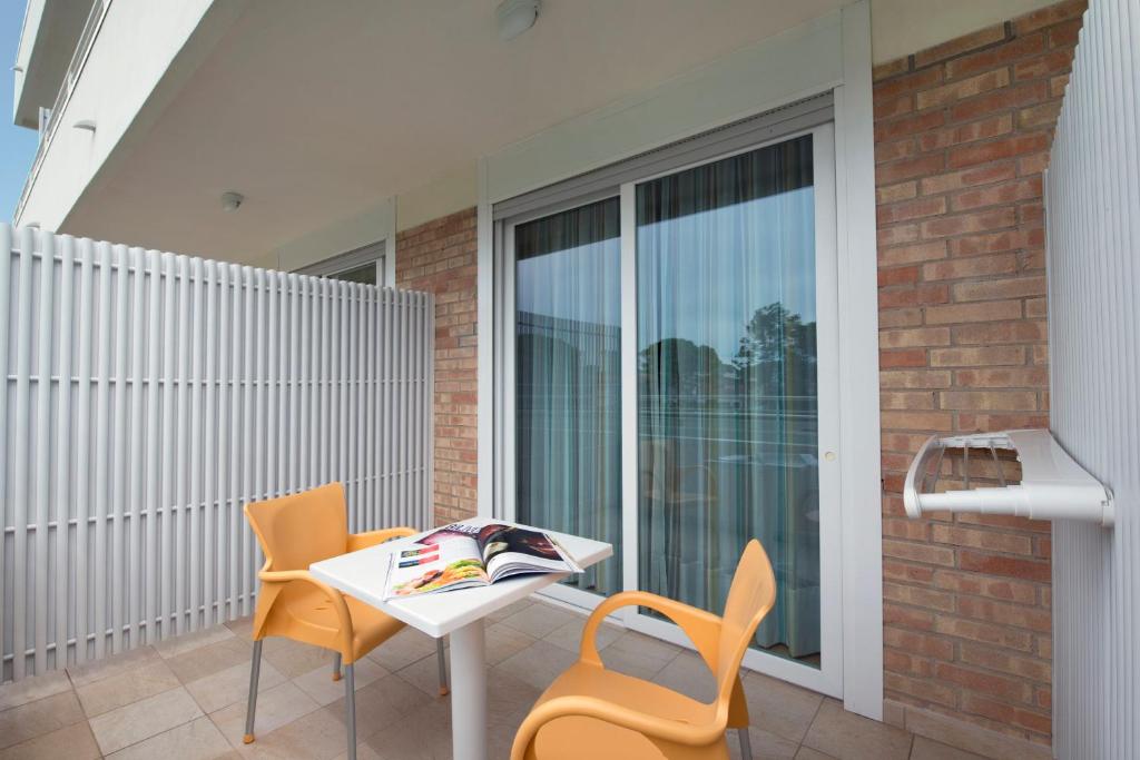 Aria condizionata, riscaldamento, cassetta di sicurezza, telefono, minibar (vuoto), terrazzo di mq 5 con tavolino e 2 poltroncine, servizi completi con box doccia in cristallo, asciugacapelli, set cortesie in omaggio, TV color SAT da 19 pollici, pavimenti ed arredi in materiali antiallergici, grande finestra di mq 4,5 con tapparelle elettriche. Compresi nel prezzo parcheggio e servizio spiaggia: ombrellone, 2 lettini e uso cabina, teli mare in spugna.