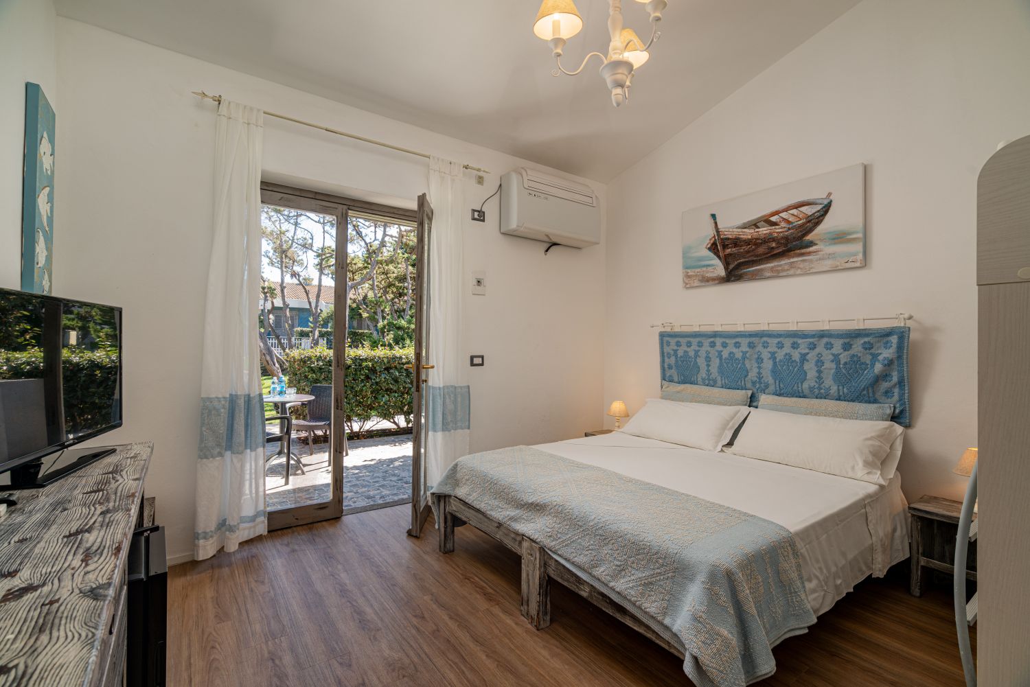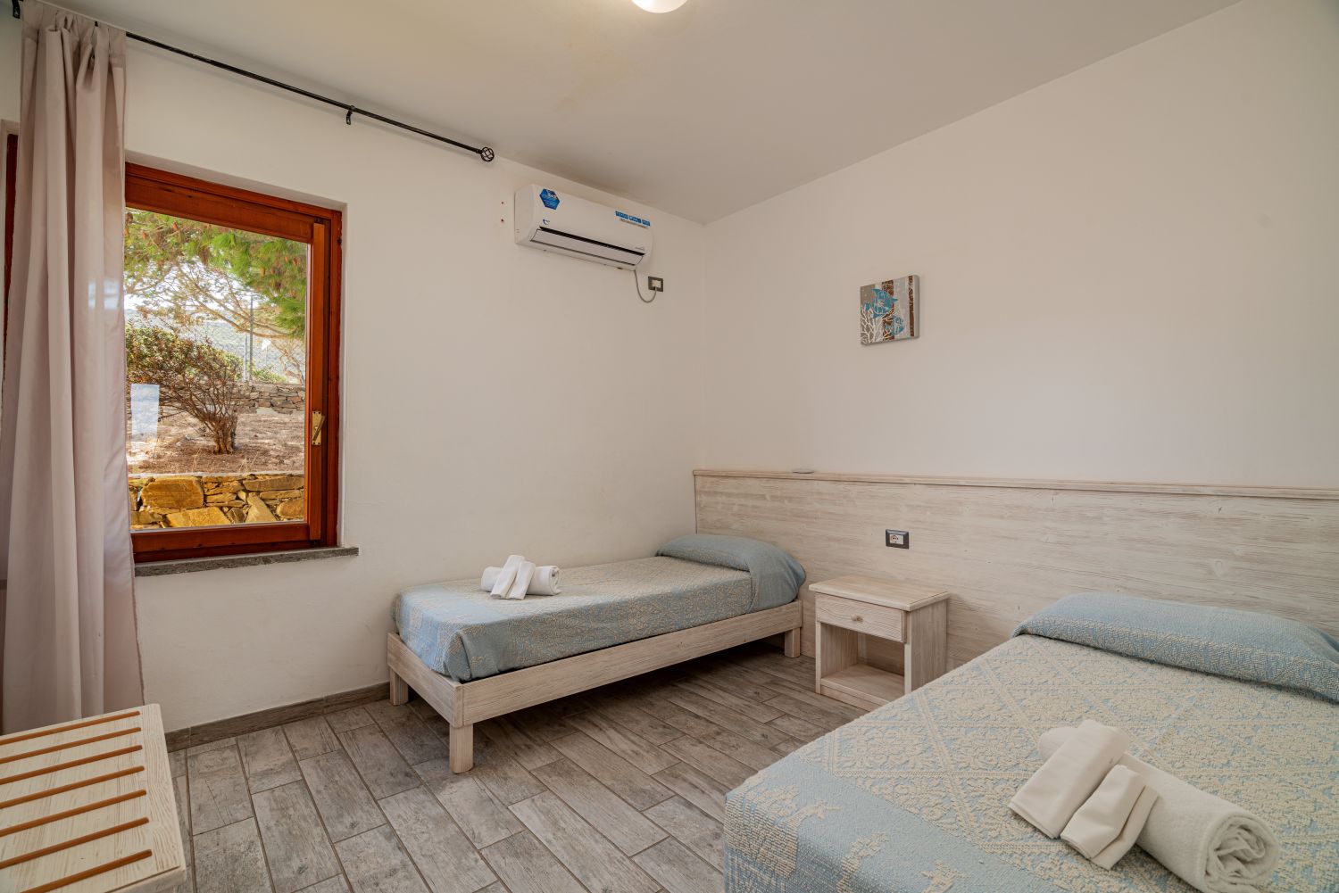 62 ampie camere, totalmente rinnovate, immerse nel verde. Dispongono tutte di aria condizionata autonoma, tv, cassaforte, mini-frigo, asciugacapelli e servizi. Si dividono in camere doppie, matrimoniali, triple e quadruple con letto a castello.Spiaggia