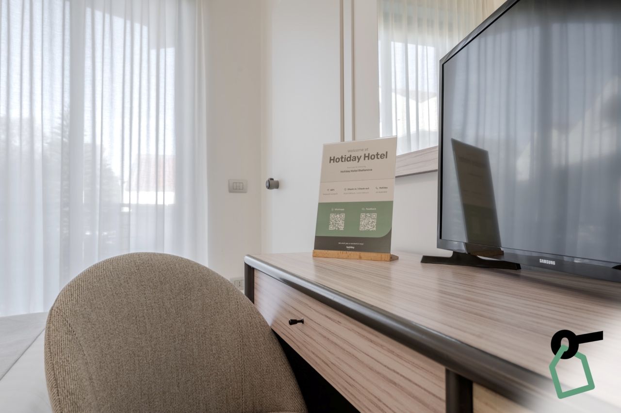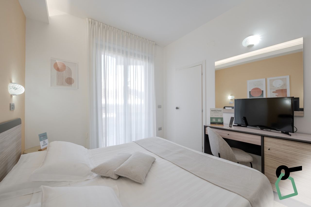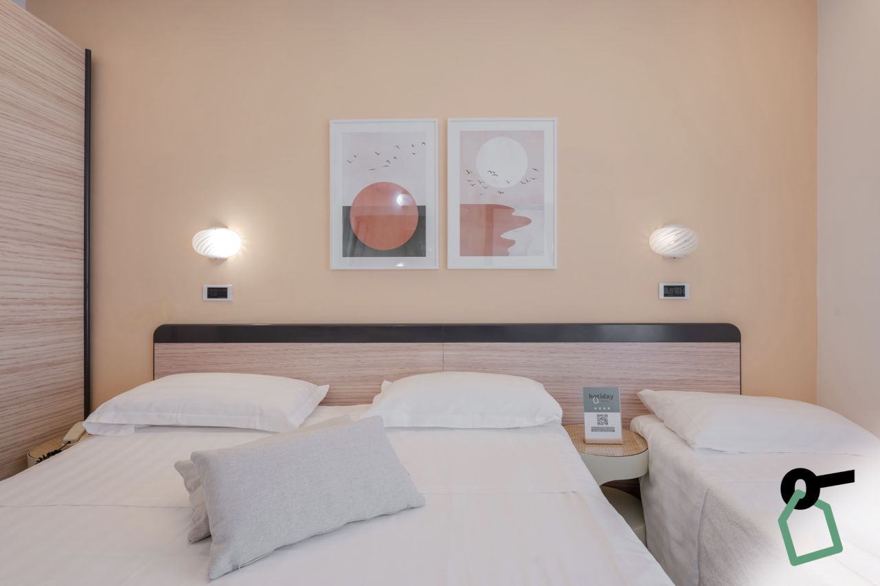 L’Hotiday Room Collection propone tre diverse tipologie di camere Comfort, pensate per soddisfare esigenze di soggiorno differenti. Sono tutte dotate di balcone, aria condizionata, TV, minibar e cassaforte, assicurando un soggiorno confortevole e rilassante. Camera Doppia Comfort: 12 mq, ideale per coppie ed offre spazi funzionali con balcone e tutti i principali comfort. Camera Tripla Comfort: 14/16 mq, può ospitare fino a tre ospiti (letto matrimoniale + singolo) ed è dotata di vista mare laterale. Camera Quadrupla Comfort: 16 mq, può ospitare fino a quattro ospiti (letto matrimoniale + letto a castello) ed è dotata di vista mare laterale.Spiaggia