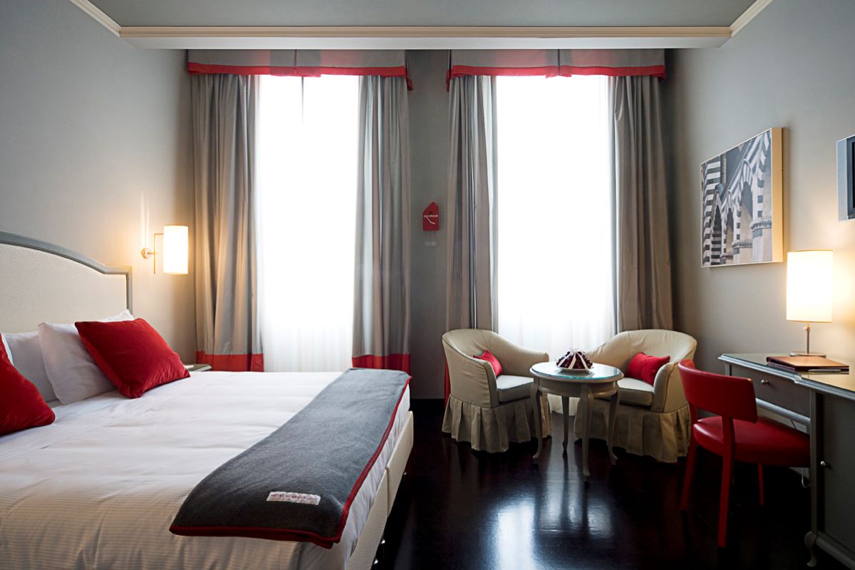 Luminose, colorate di rosso, grigio e bianco, con un arredamento essenziale ma completo; alcune dispongono anche di comodo angolo studio, poltroncine e camino. Sono tutte comode, accoglienti e dotate dei più moderni comfort e servizi, prodotti da bagno originali e vanity set. La tipologia di camere è divisa in: French: sono sistemazioni facili e veloci, ideali per un weekend a Firenze per una clientela giovane e dinamica.Sono dotate di letto matrimoniale alla francese, garantiscono tutti i confort moderni, come connessione wi-fi open e tv a schermo piatto e bagni privati con doccia. Classic: sistemazioni eleganti e semplici allo stesso tempo, le loro finestre offrono un punto di vista romantico sulle tipiche corti interne degli antichi palazzi fiorentini.Le camere Classic sono composte da zona notte con letto matrimoniale, o due letti singoli, postazione lavoro, bagno privato con doccia o vasca. Superior con vista: sistemazioni con un ambiente contemporaneo e confortevole grazie ad una comoda zona notte dotata di letto matrimoniale, o due piazze singole, angolo studio con scrivania, salottino e perfino un camino (possibilità di aggiungere un terzo letto singolo).Carratteristica distintiva di questa tipologia di camere è la meravigliosa vista sulla bellissima piazza e sulla Chiesa di Santa Maria Novella, permettendo di entrare nell’atmosfera fiorentina.Amici a 4 Zampe