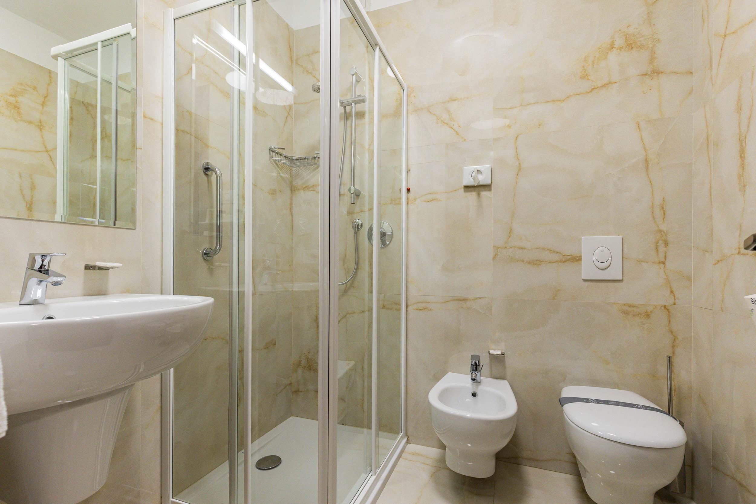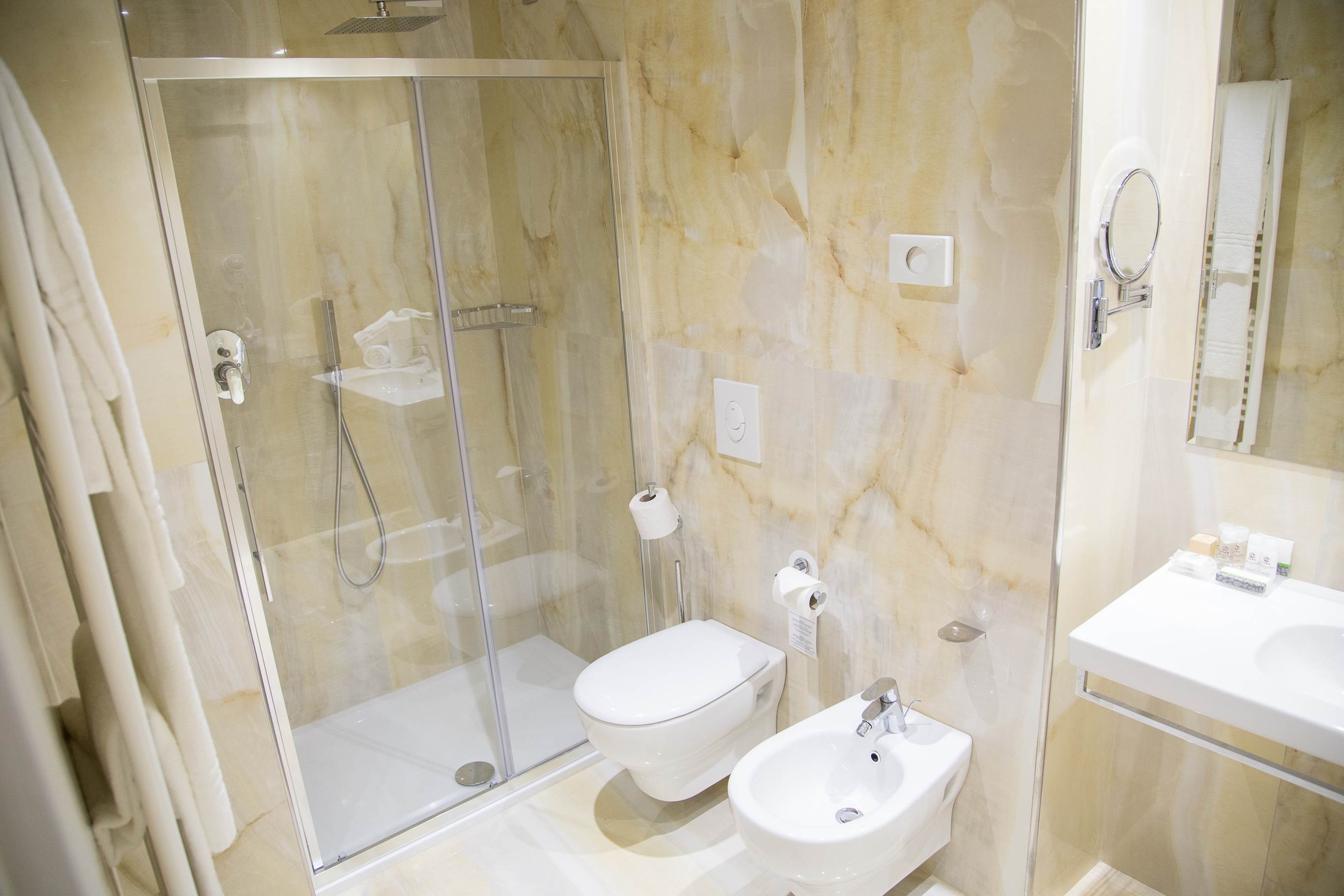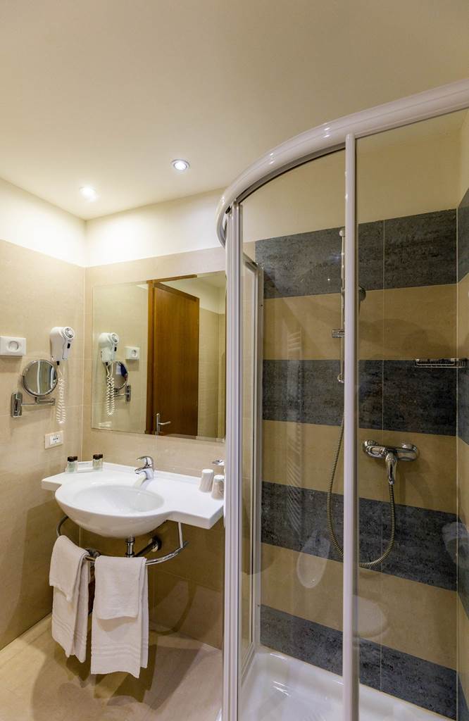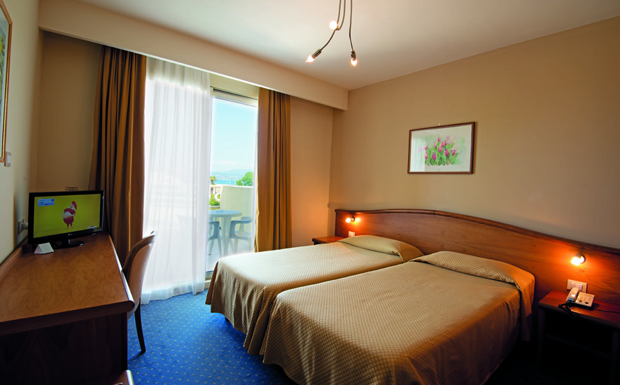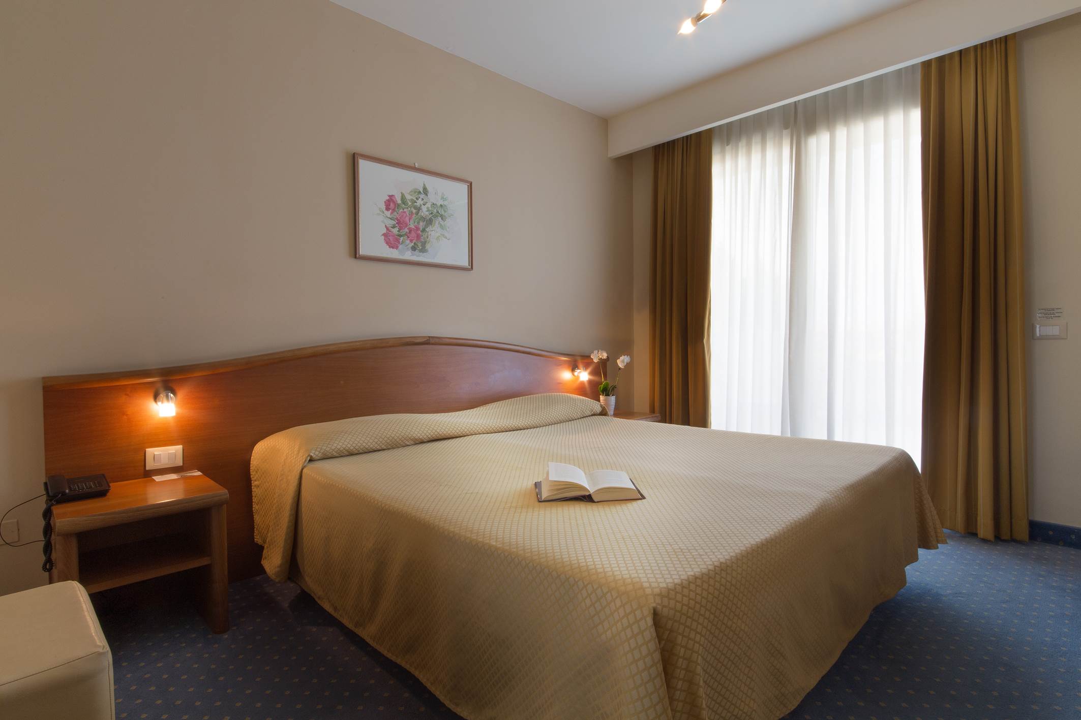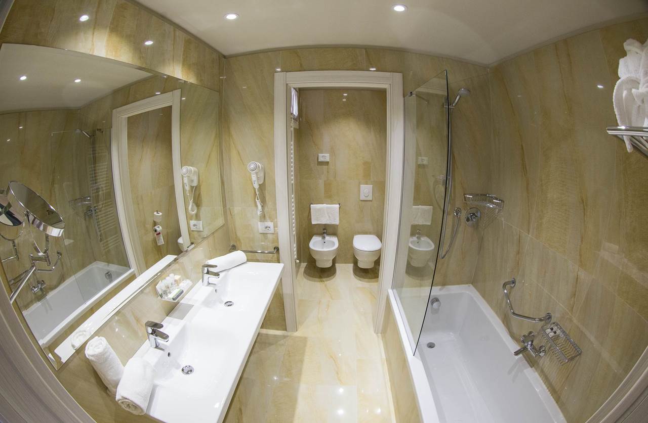 BB2 Classic: camera doppia Classic, 21 mq. ca. , matrimoniale o due letti separati - bagno in marmo con doccia - balcone con vista giardino, interna o laterale. Camera dotata di phon, telefono, Tv Sat, Safe, frigobar, aria condizionata, Wi-fi.