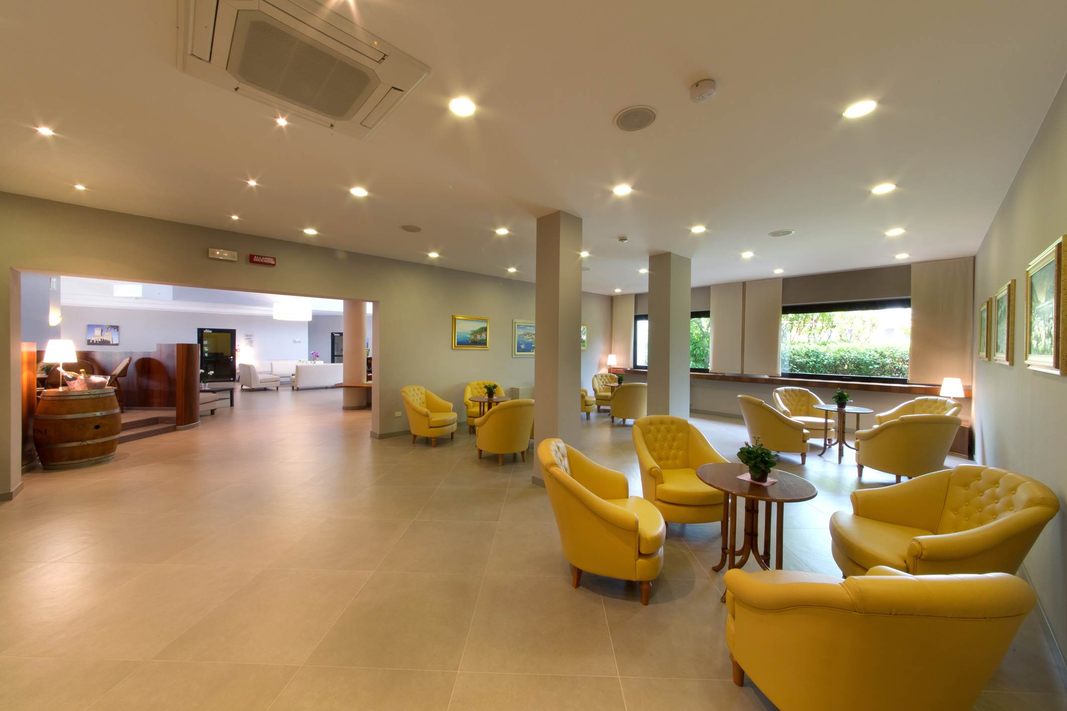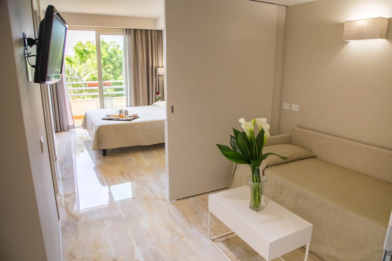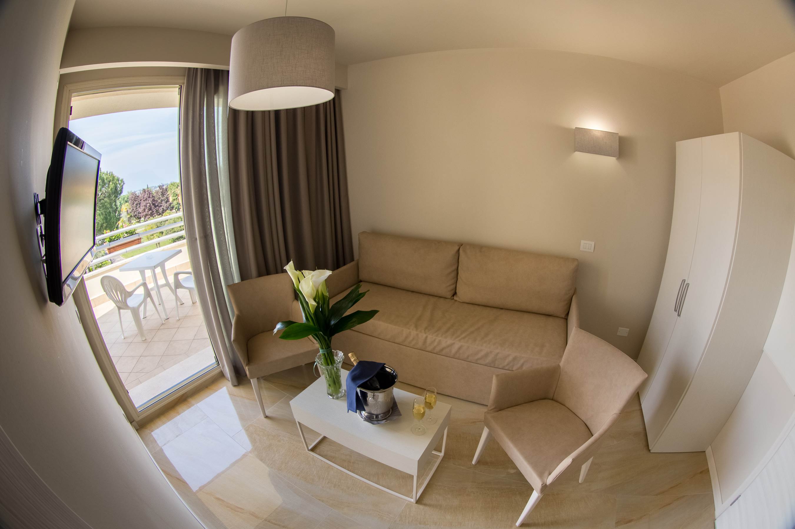 J4 Junior Suite: Junior Suite, 29 mq. ca., camera matrimoniale e salottino con divano letto, bagno in marmo con doccia - balcone o terrazza. Camera dotata di phon, telefono, Tv Sat, Safe, frigobar, aria condizionata, Wi-fi.