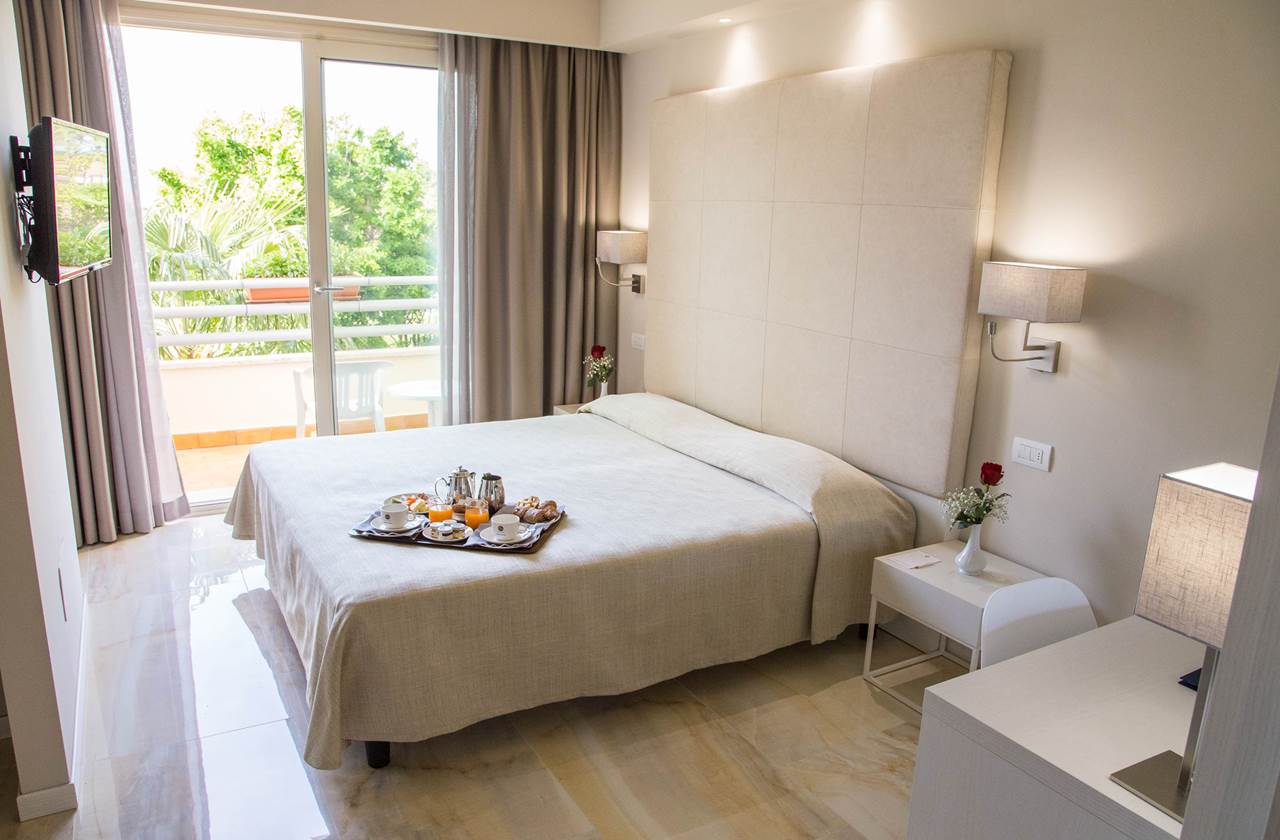 D2 Standard: camera doppia Standard, 17/20 mq. ca., matrimoniale o con due letti separati, bagno in marmo con doccia - balcone o terrazza, vista giardino o interna. Camera dotata di phon, telefono, Tv Sat, Safe, frigobar, aria condizionata, Wi-fi.