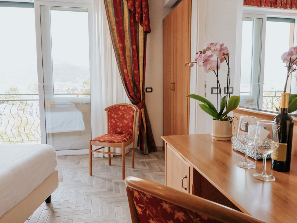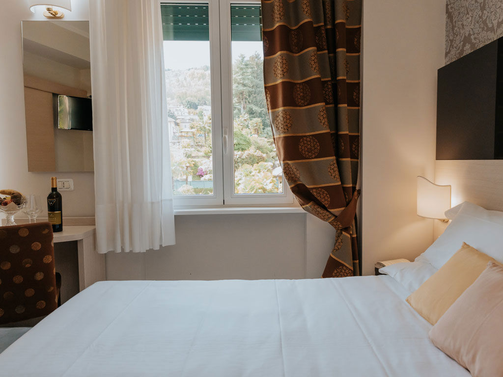 D2 camera Deluxe vista monti: 18mq ca. Camera doppia vista montagna, con balcone attrezzato, dotata di aria condizionata, TV, frigobar, safe , telefono, asciugacapelli e Wi-Fi gratuito, bagno con doccia o vasca. V2 camera Deluxe vista lago laterale: 18mq ca. Camera doppia vista lago parziale , con balcone attrezzato, dotata di aria condizionata, TV, frigobar, safe , telefono, asciugacapelli e Wi-Fi gratuito, bagno con doccia o vasca.La quota comprende