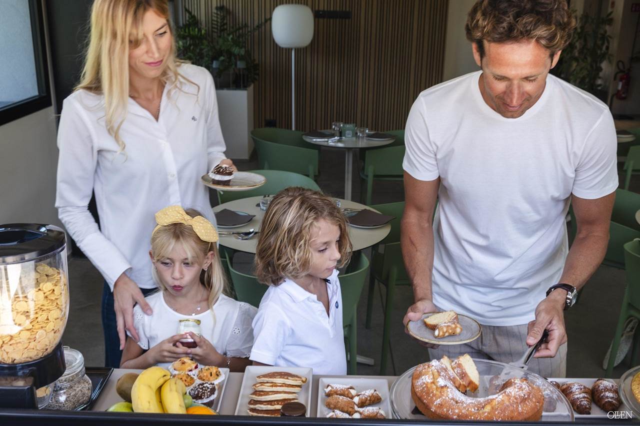 Nella nostra luminosa sala circondata dal verde allestiamo un ricco buffet per la colazione.