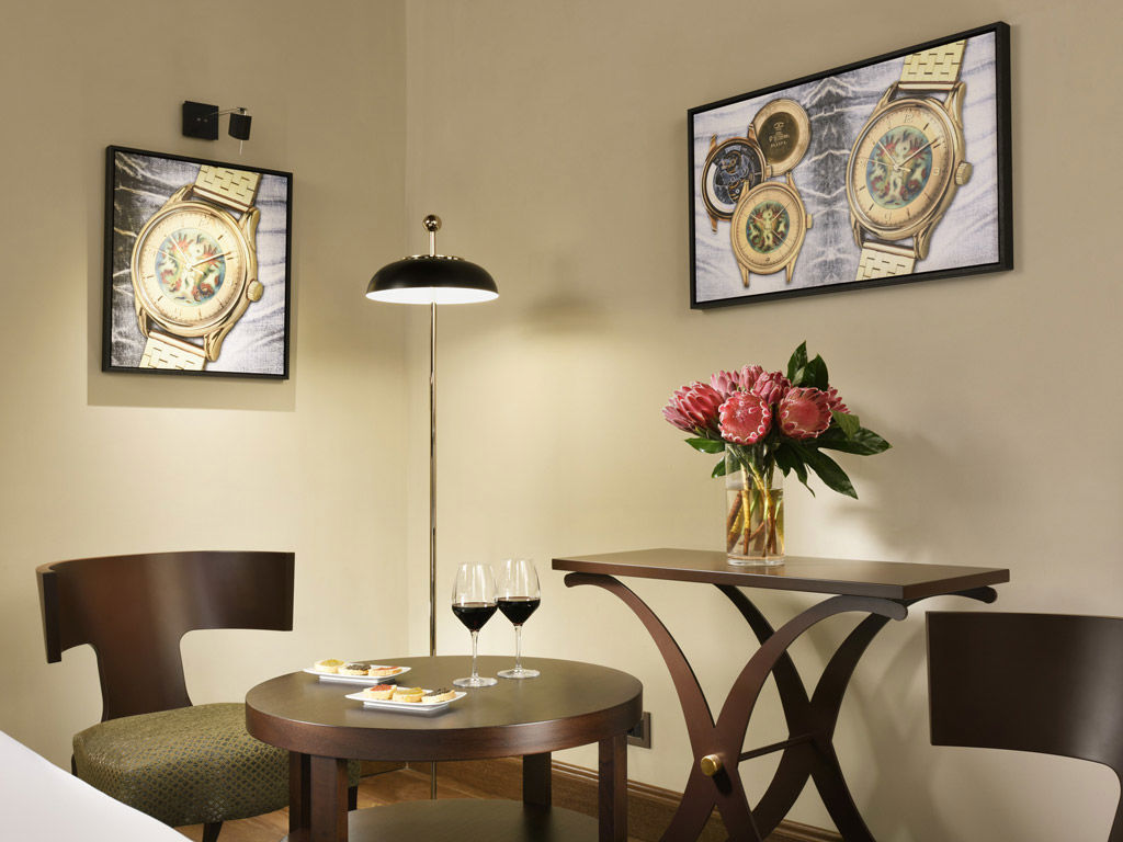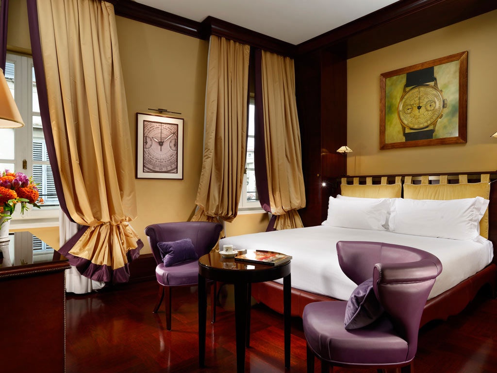 Un albergo 4 stelle signorile e contemporaneo: l’arredo a tema è ispirato al magico mondo dell’alta orologeria. Ciascun piano dell'hotel è un omaggio a una maison di orologi da polso di lusso: Rolex, Vacheron - Constantin e Patek Philippe. Le camere arredate con ricercata eleganza hanno materiali di pregio, bagni in marmo e dettagli curiosi: le maniglie delle porte a forma di lancette e i rubinetti del lavello che sembrano corone di carica di orologi. La sala colazione al quarto piano, con vista mozzafiato della Basilica, si trova in un’autentica loggia rinascimentale. Nel lounge bar al piano terra si può sostare per un drink o un pasto leggero a tutte le ore del giorno. Completo di sala meeting e area fitness, l’Hotel L’Orologio è la location ideale per una clientela business, raffinata ed esigente, e per chi cerca qualcosa di unico.Posizione