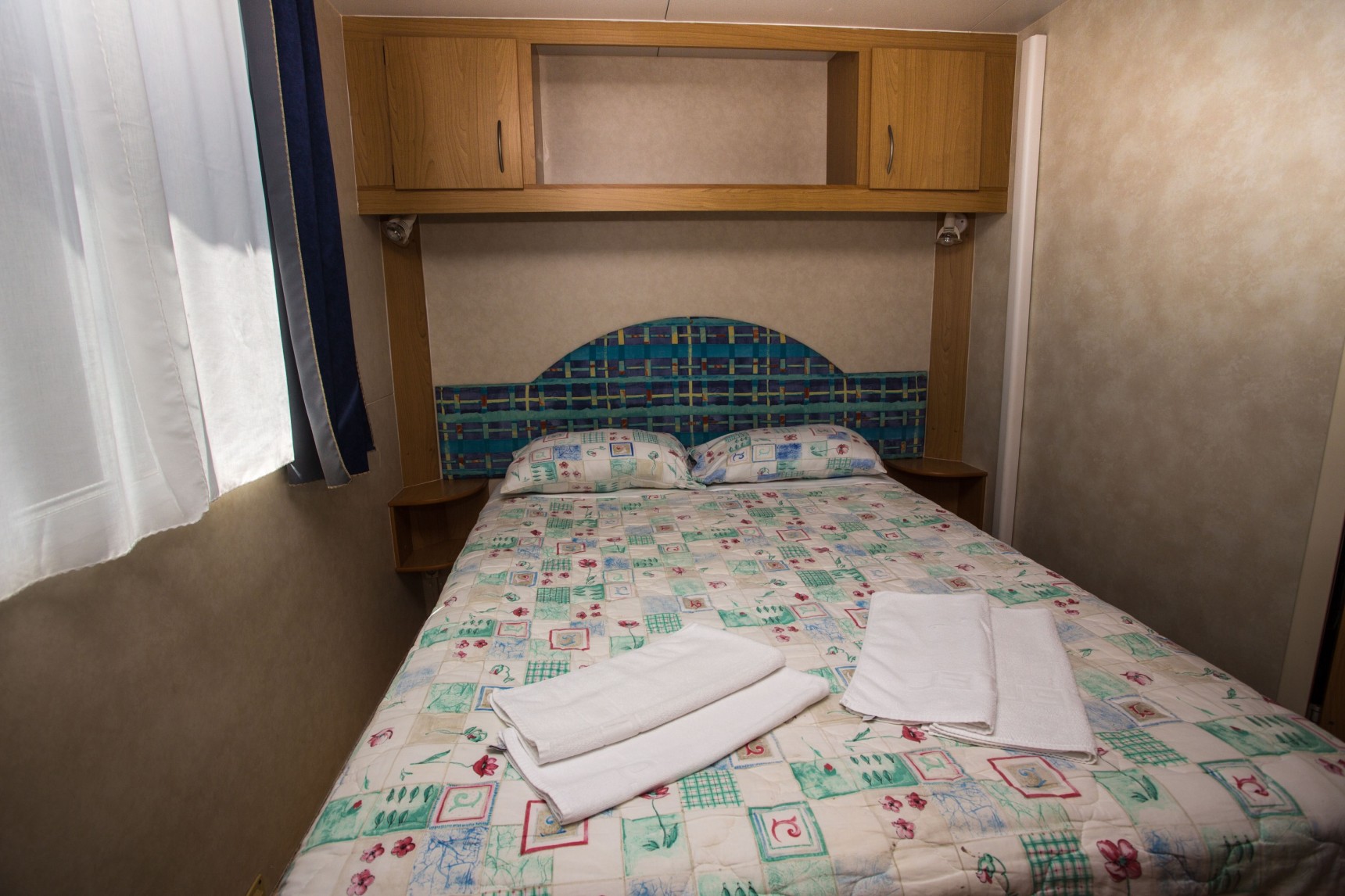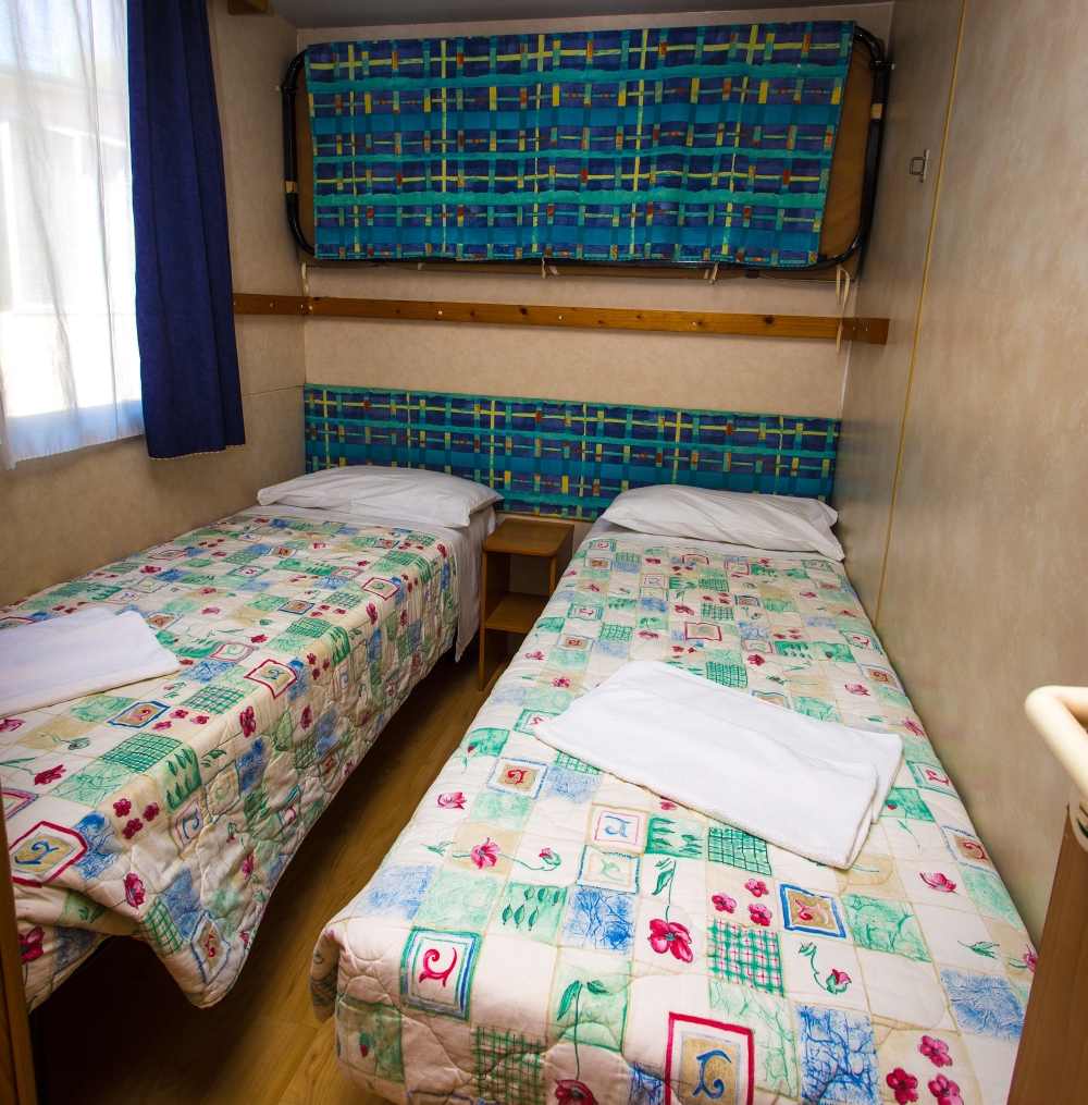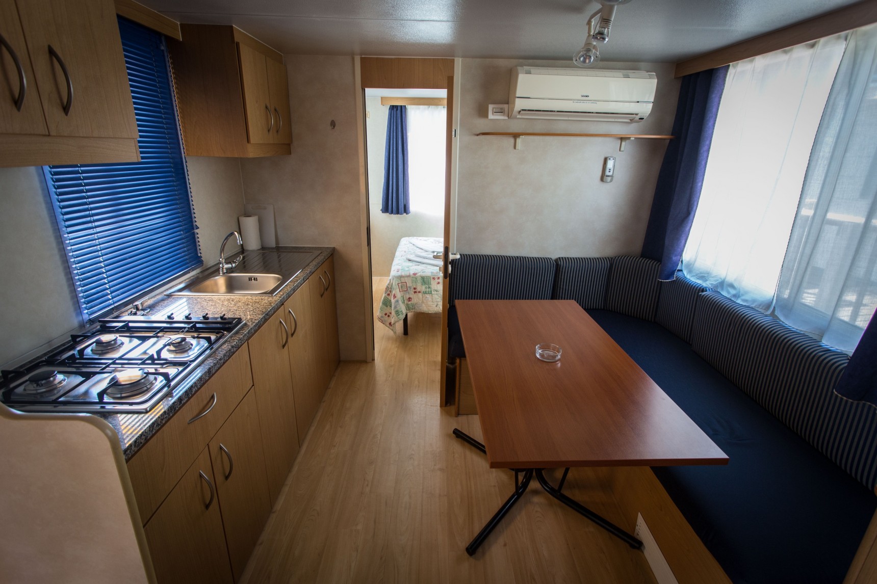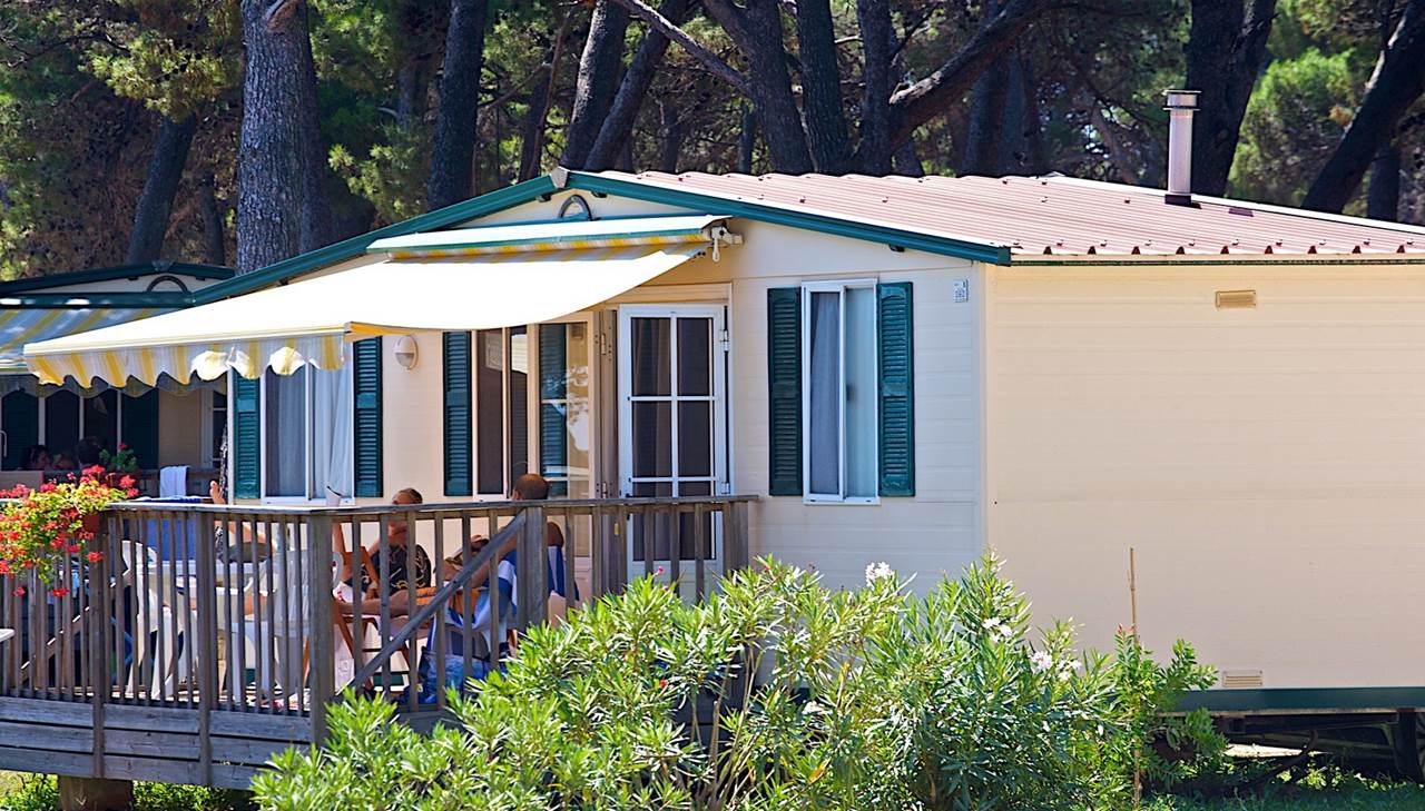 Casa Mobile 4-5 persone: soggiorno con divano, angolo cucina completamente attrezzato (stoviglie e posate, angolo cottura, frigorifero con freezer), camera padronale con letto matrimoniale (140x190 cm), una camera con due letti separati (70x190 cm) ed un letto aggiuntivo (65x180 cm), bagno con doccia, terrazza arredata. Servizi: aria condizionata, TV satellitare, Wi-Fi. Superfice: 24 mq + terrazza 12 mq. Lato parco oppure mare.Spiaggia