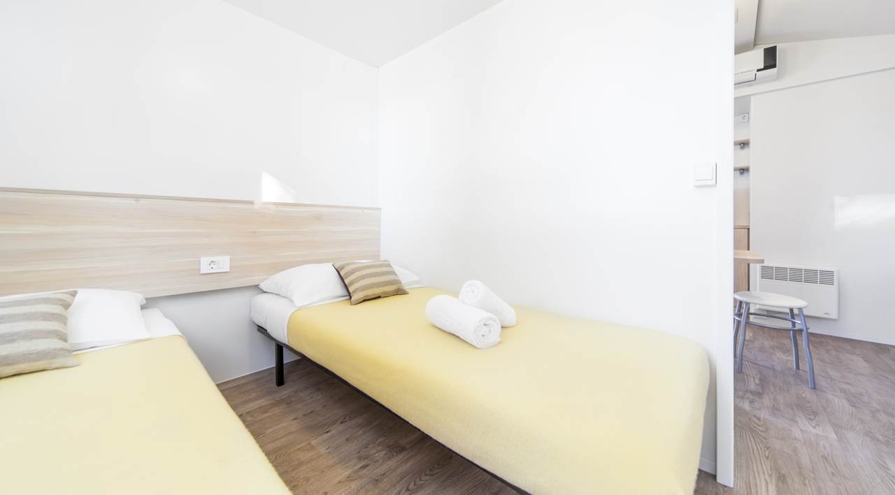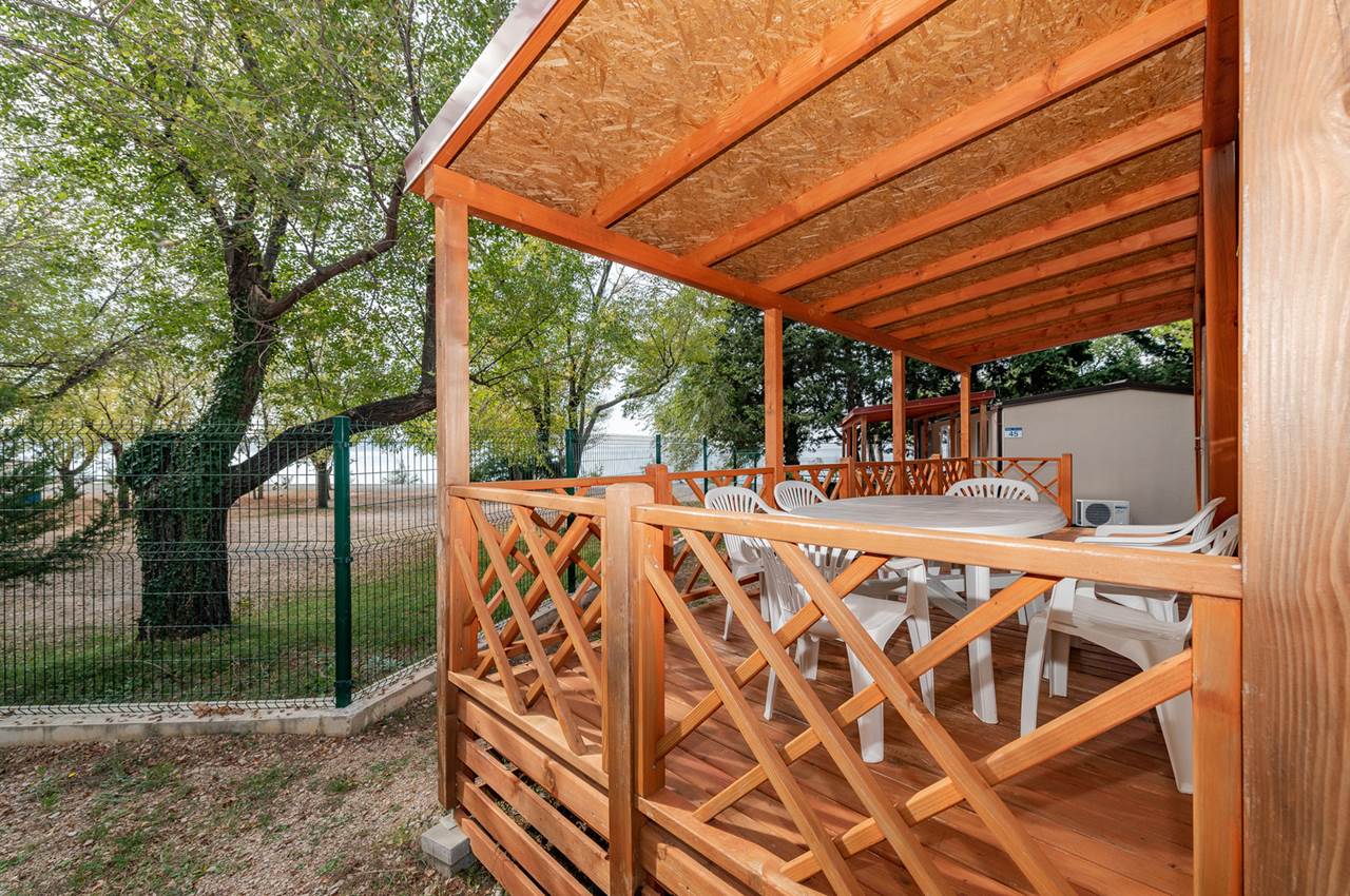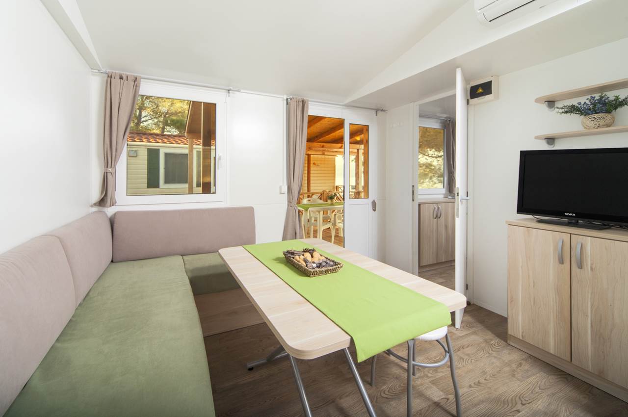 Mobilhome Superior (4+2): 2 camere da letto (una con letto matrimoniale 140x200 cm e l'altra con 2 letti singoli 80x190 cm), soggiorno con divano letto (130x190 cm), angolo cottura, 2 bagni (doccia, WC, asciugacapelli), terrazza con zona soggiorno. Servizi: aria condizionata, TV LCD satellitare, Wi-Fi, frigorifero, bollitore, macchina per il caffè.Spiaggia