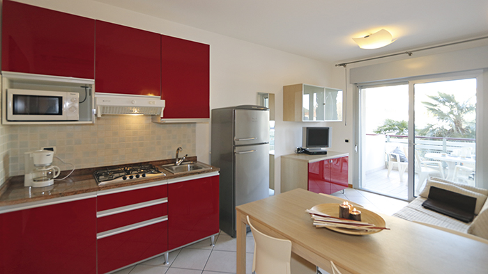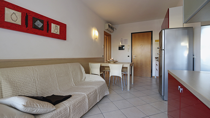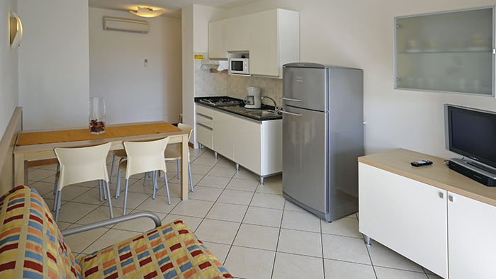 - Bilocale tipo B (35/40 mq - occupazione minima 1 adulto, occupazione massima 4 adulti) composto da soggiorno con divano letto doppio, 1 camera con 2 letti singoli eventualmente unibili, angolo cottura, ampio terrazzo coperto, posto auto riservato nel pergolato