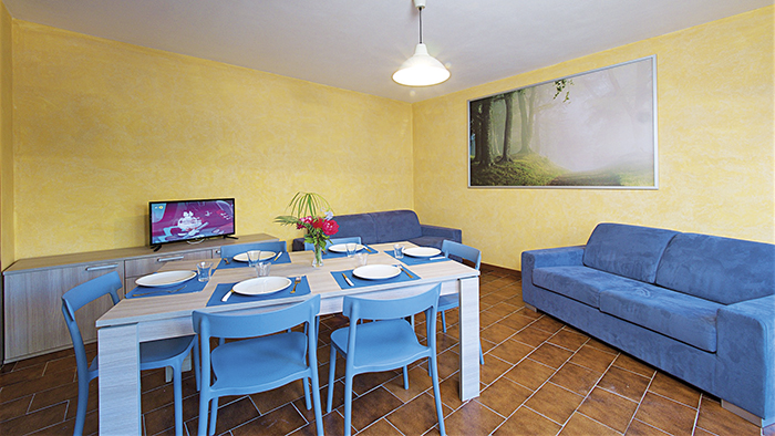 - Trilocali tipo B Classic: (60 mq), sono composti da una camera matrimoniale, una camera con 2 letti singoli e soggiorno con divano letto. Occupazione mimima: 4 adulti / Occupazione massima: 6 adulti.