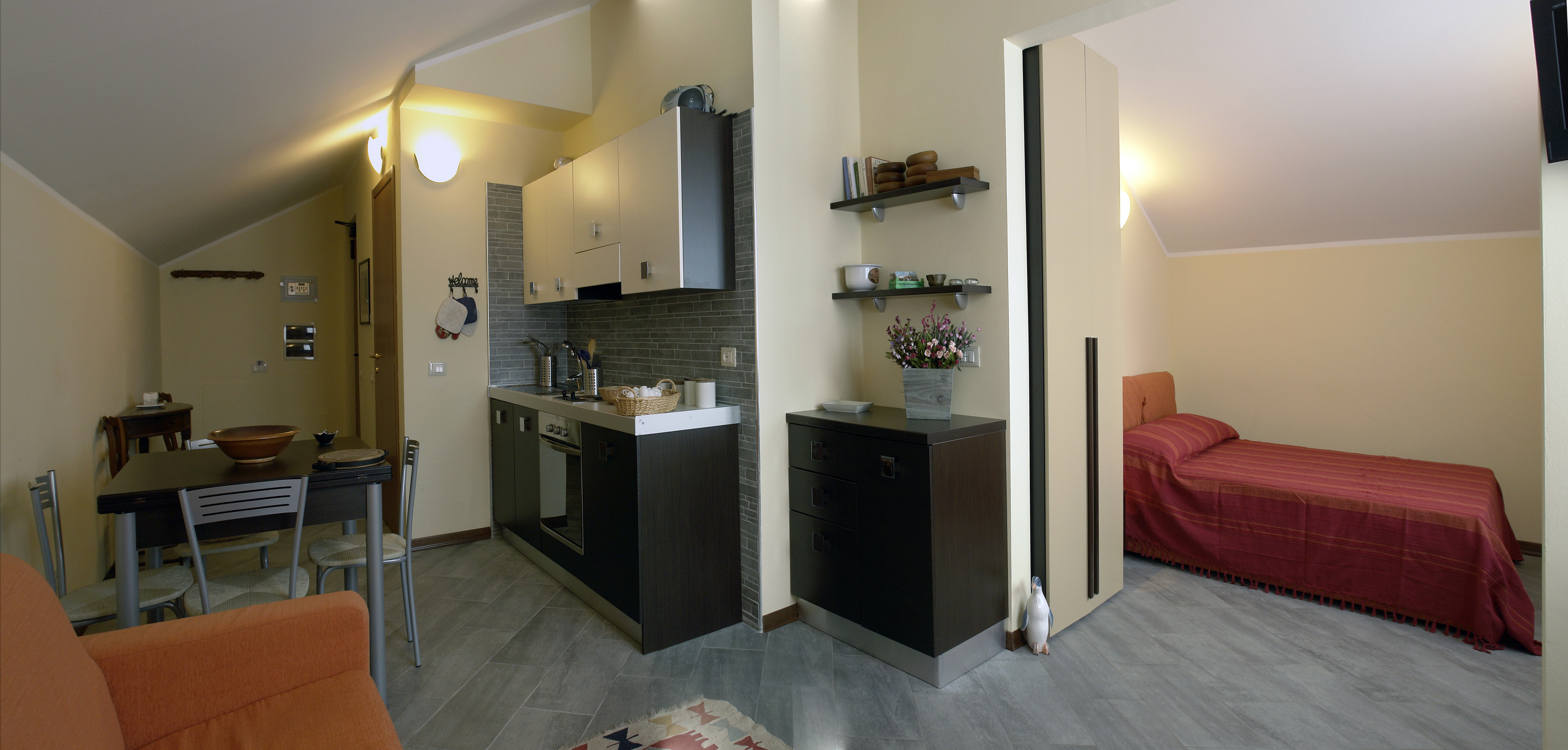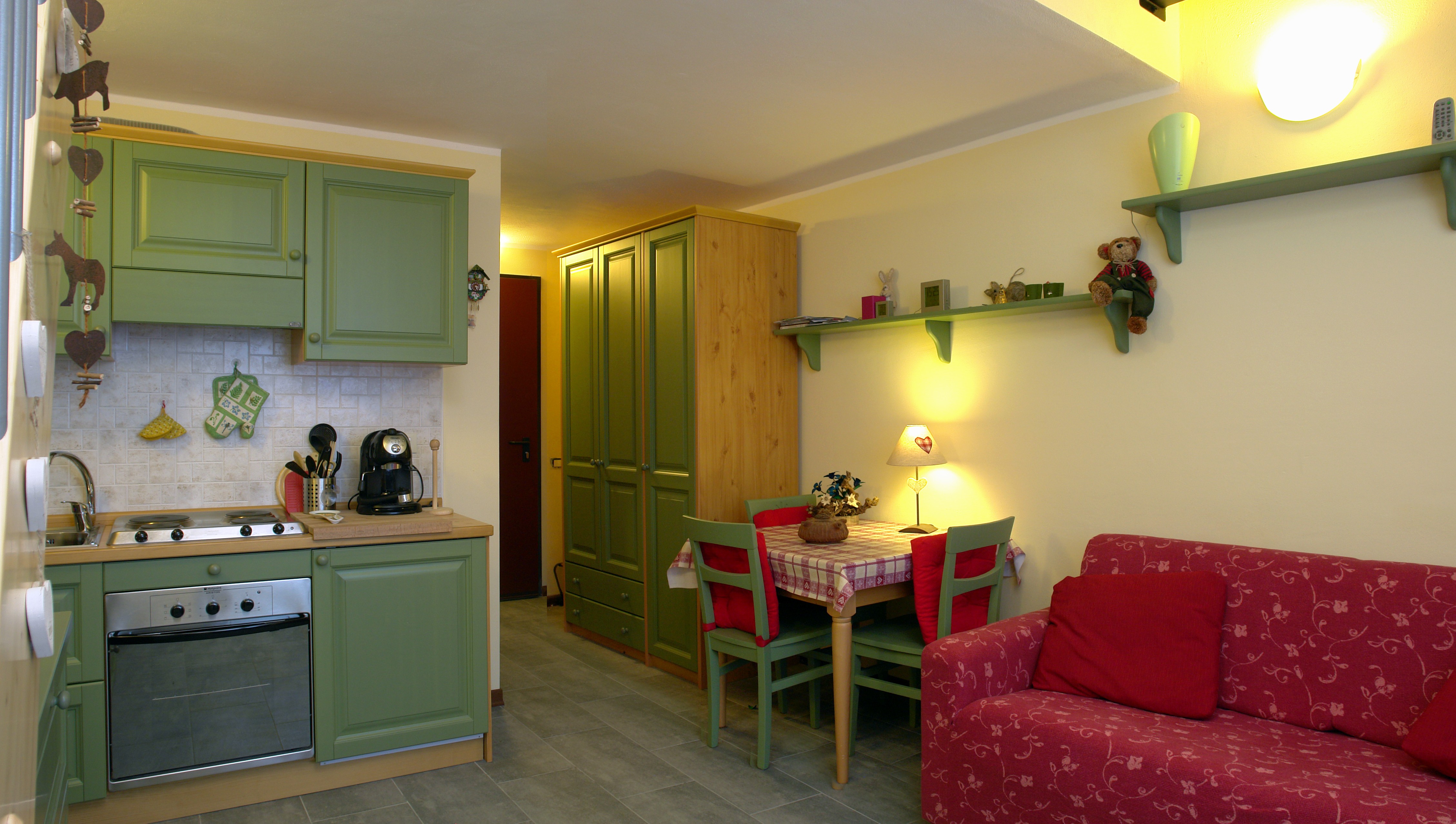 Gli appartamenti presentano arredi in pino stile montagna e con balcone o piccolo giardino. Dispongono di servizi privati con box doccia, angolo cottura con piastre elettriche, frigorifero, forno, macchina del caffè, pentole e stoviglie. Possono essere: