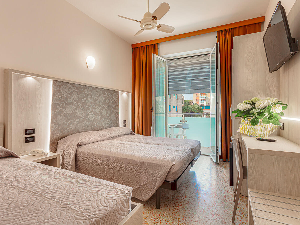 Le camere Standard (circa 20 mq - occupazione massima 4 adulti), completamente rinnovate, dispongono di servizi privati con box doccia, set di cortesia, asciugacapelli, frigobar, cassaforte, aria condizionata, Tv-Sat e balcone. Le camere quadruple presentano letti distesi. Su richiesta con supplemento: camera singola.