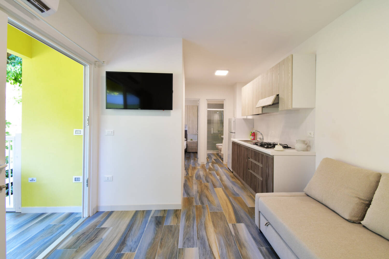 * Trilocale 5B Deluxe (32 mq - occupazione massima 5 adulti) è un appartamento in muratura di recente ristrutturazione situato al centro del villaggio, precisamente sopra il ristorante e la piscina. Composta da camera matrimoniale, 2° camera con letto singolo, soggiorno con tavolo e divano letto matrimoniale, angolo cottura con stoviglie e pentolame, lavello e frigo, Tv-sat, servizi privati con box doccia, wc e bidet, aria condizionata e veranda coperta. Animali non ammessi.
