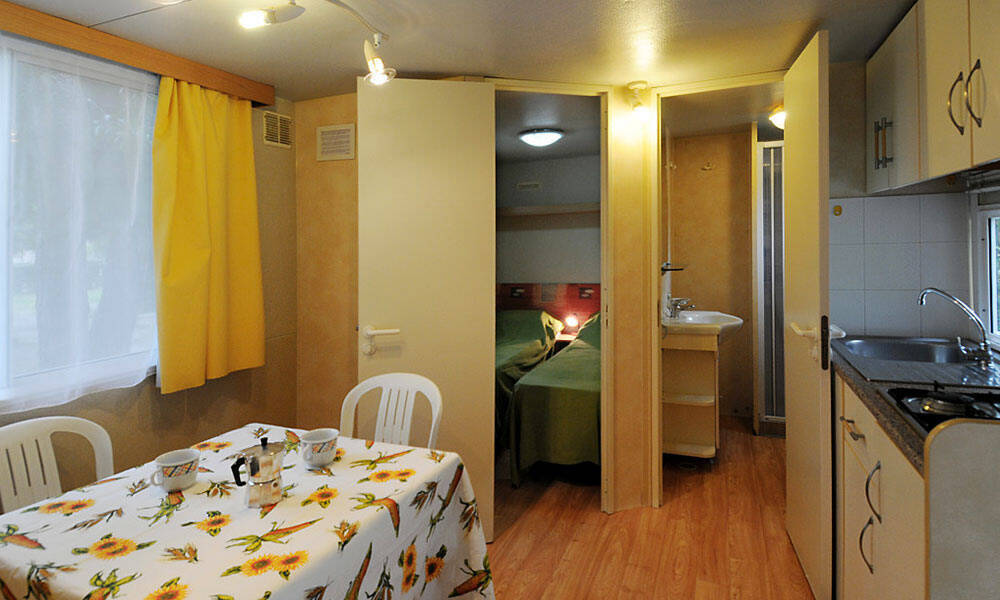 * Casa Mobile Aurora Deluxe (36 mq - occupazione massima 5 adulti) con camera matrimoniale, 2° camera con 2 letti singoli, soggiorno con divano letto, angolo cottura con stoviglie e pentolame, lavello e frigo, Tv-sat, servizi privati con box doccia, wc e bidet, aria condizionata e veranda coperta. Animali non ammessi.