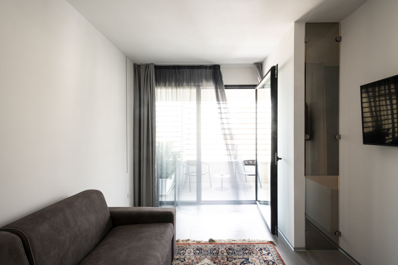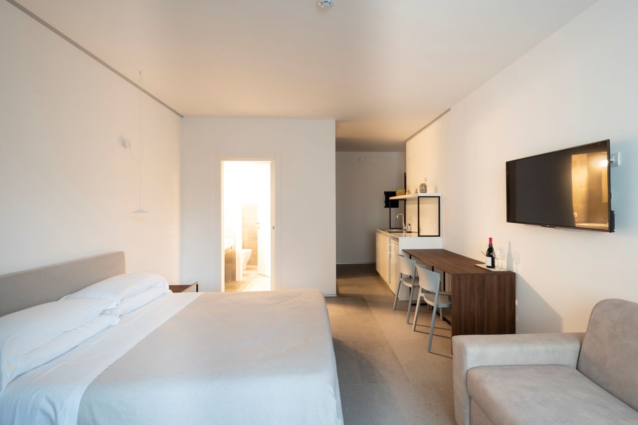 Tre tipologie di Suite, arredate con elegante funzionalità e dotate dei più moderni servizi, per un concetto di ospitalità dinamico ed innovativo. Suite Deluxe: dispone di una zona pranzo, area living con TV, cucina attrezzata, forno a microonde e frigorifero. Dotata di aria condizionata indipendente, bagno con doccia panoramica, bidet e asciugacapelli, cassaforte, telefono e connessione Wi-Fi. La zona notte è composta da un letto matrimoniale ed un divano letto o letto singolo. Junior Suite: bilocale composto da soggiorno, con divano letto, angolo cottura con zona pranzo, e camera matrimoniale. Bagno con doccia panoramica, bidet e asciugacapelli. Una delle Junior Suite è dotata anche di vasca con idromassaggio e cromoterapia in camera. Dotata di aria condizionata indipendente e per singola zona, cassaforte, telefono, connessione Wi-Fi e balcone. Suite Superior: bilocale con camera matrimoniale, angolo cottura con zona pranzo e divano letto. Bagno privato con doccia, bidet, asciugacapelli. Dotata di aria condizionata indipendente e per singola zona, cassaforte, telefono, connessione Wi-Fi e balcone.Amici a 4 Zampe