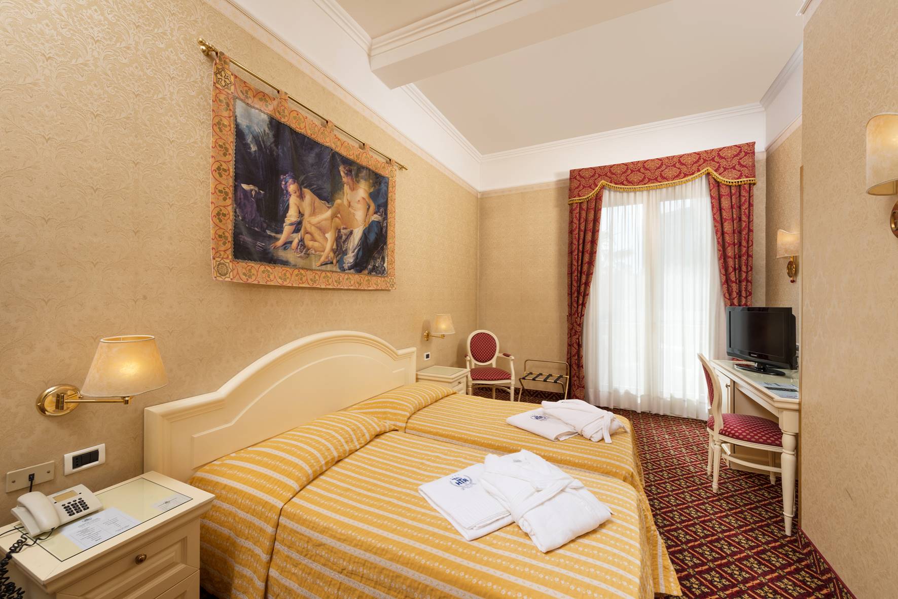 JUNIOR SUITE max occupancy 3 pax (20 m²): angolo salotto, camera da letto, bagno con doccia e asciugacapelli, balcone, aria condizionata, cassaforte, minibar, scrivania, telefono, TV satellitare, Wi-Fi gratuito.