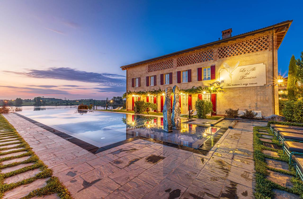 Le Ali del Frassino è un elegante resort 4 stelle situato a pochi minuti dal centro di Peschiera del Garda, immerso in un parco naturale di oltre 70.000?m² affacciato sul suggestivo laghetto del Frassino, area protetta e habitat di rara bellezza. Il complesso nasce dal sapiente restauro di edifici storici e offre un perfetto equilibrio tra charme, natura e comfort contemporaneo. La struttura è suddivisa in 5 edifici: Rustico, Fienile, Limonaia (rustici ristrutturati), Belvedere e ricevimento (nuovi edifici) e Villa Liberty. Le camere sono distribuite in cinque edifici immersi nel verde, arredate con stile raffinato e dotate di ogni comfort. La struttura dispone di una moderna area wellness con spa, sauna, bagno turco, piscina interna ed esterna, oltre a diverse zone relax pensate per rigenerare corpo e mente. Le Ali del Frassino propone due diversi ristoranti: l'Ardea Purpurea, situato sulla terrazza dell’incantevole Villa dei primi del novecento, propone prodotti locali e stagionali; il menù include anche pizze gourmet con farine macinate a pietra, ideali sia a pranzo che a cena. Il ristorante grill Il Tuffetto, aperto durante la stagione estiva, per gustare semplici e gustosi piatti del territorio al bordo della scenografica piscina. Ideale per soggiorni romantici, eventi privati e matrimoni, il resort è anche pet-friendly, accogliendo gli animali domestici con attenzione e servizi dedicati.Posizione