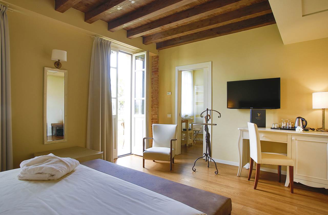 DC2 camera doppia Comfort, 16-20mq. Dispongono di doccia, phon, telefono, TV Sat, safe, frigobar, aria condizionata, Wi-Fi, vista giardino o vigneti. DLX4 camera doppia De Luxe con possibilità di letto aggiunto, 18-24mq. Dispongono di doccia, phon, telefono, TV Sat, safe, frigobar, aria condizionata, Wi-Fi, balcone o terrazzo, vista lago del Frassino. Possono essere su un piano o su 2 piani. In tutte le camere vengono fornite ciabattine, accappatoio e bollitoreLa quota comprende