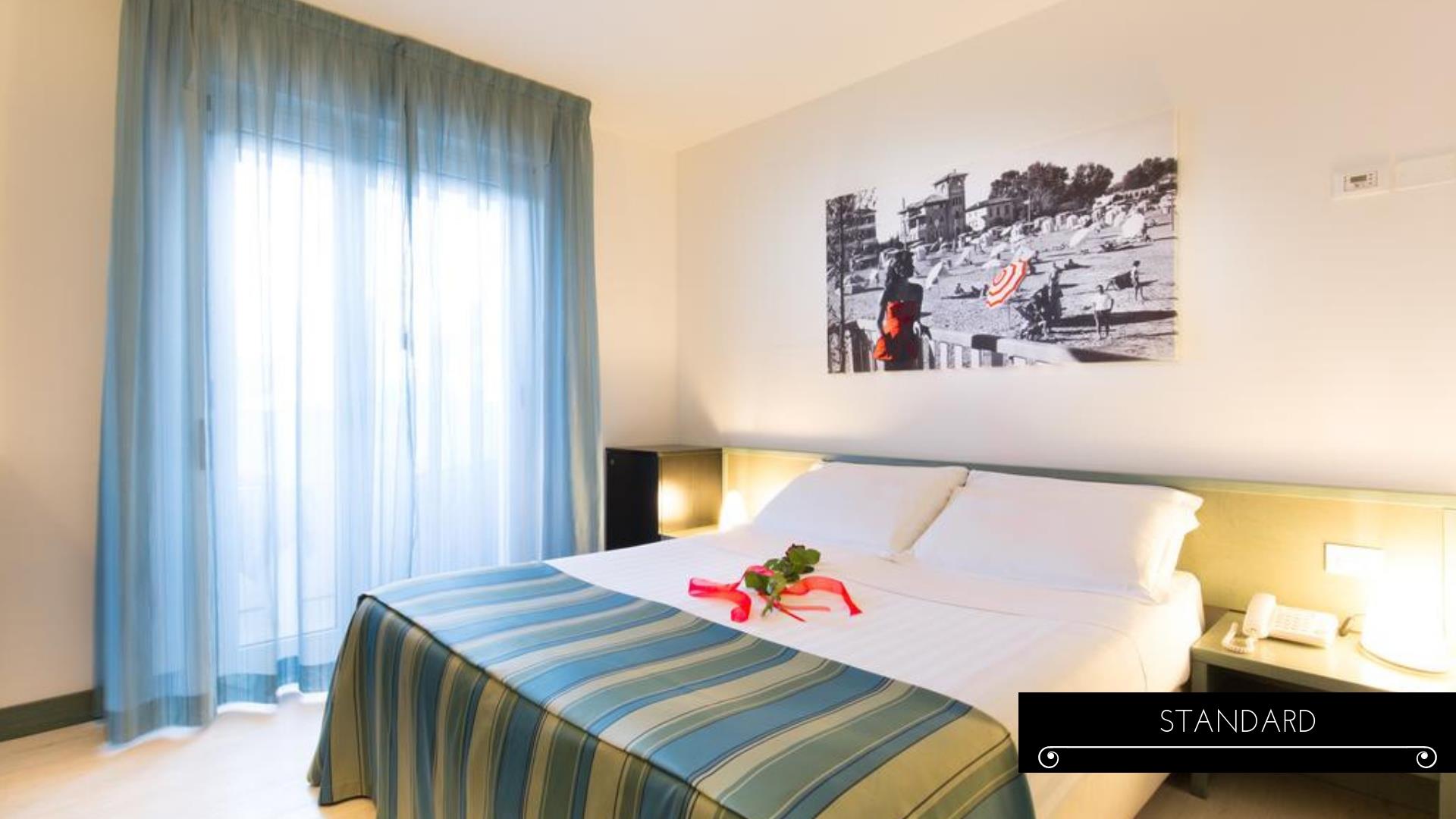 STANDARD max occupancy 3 pax (19 mq): matrimoniale/doppia con terzo letto, balcone, aria condizionata, minibar con bevande a pagamento, cassaforte, Tv-Sat, WiFi, bagno con doccia, WC e asciugacapelli.