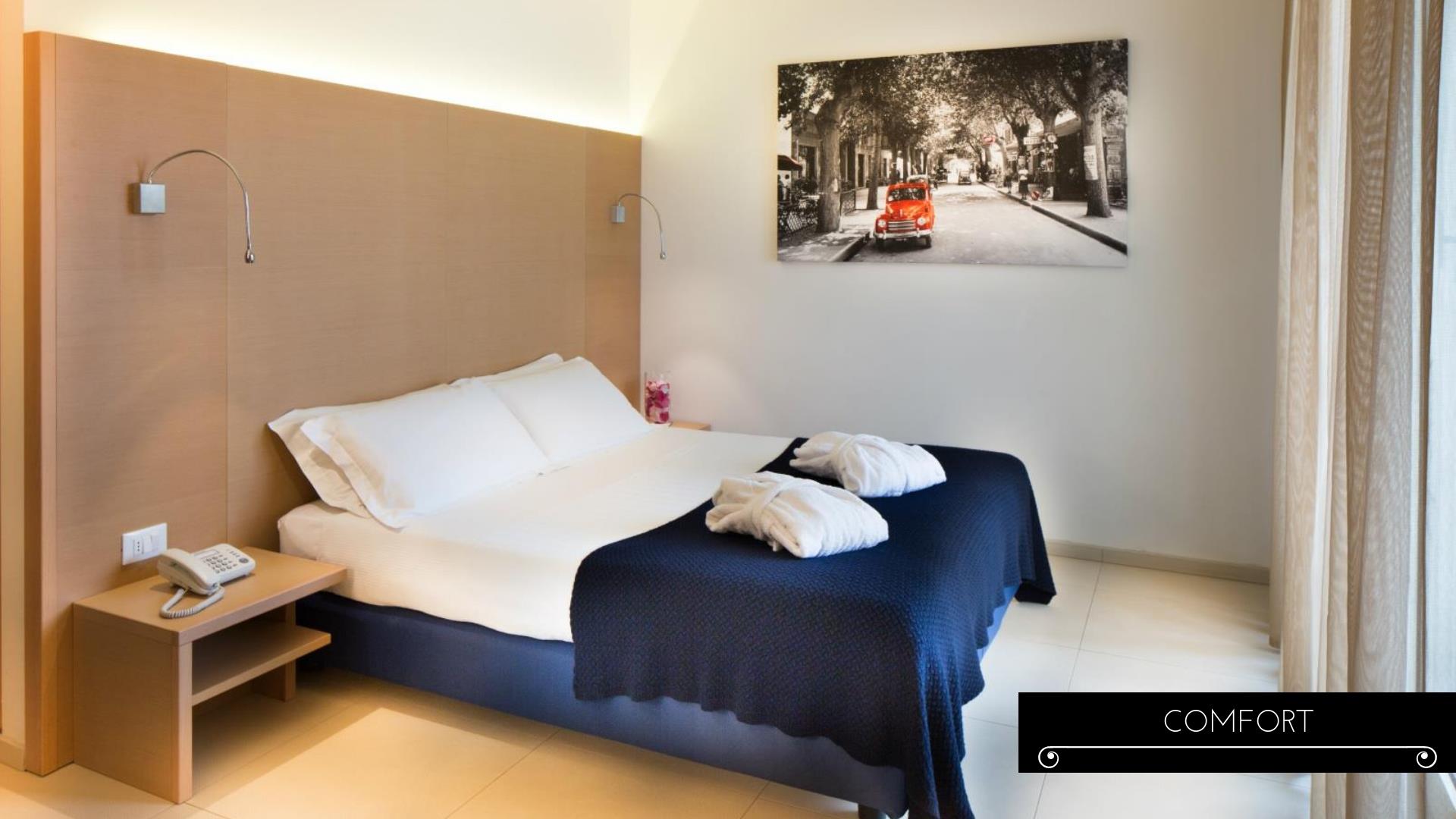 COMFORT max occupancy 3 pax (19 mq): matrimoniale/doppia con terzo letto (culla non ammessa), balcone, aria condizionata, minibar con bevande a pagamento, cassaforte, Tv-Sat, WiFi, bagno con doccia, WC e asciugacapelli.