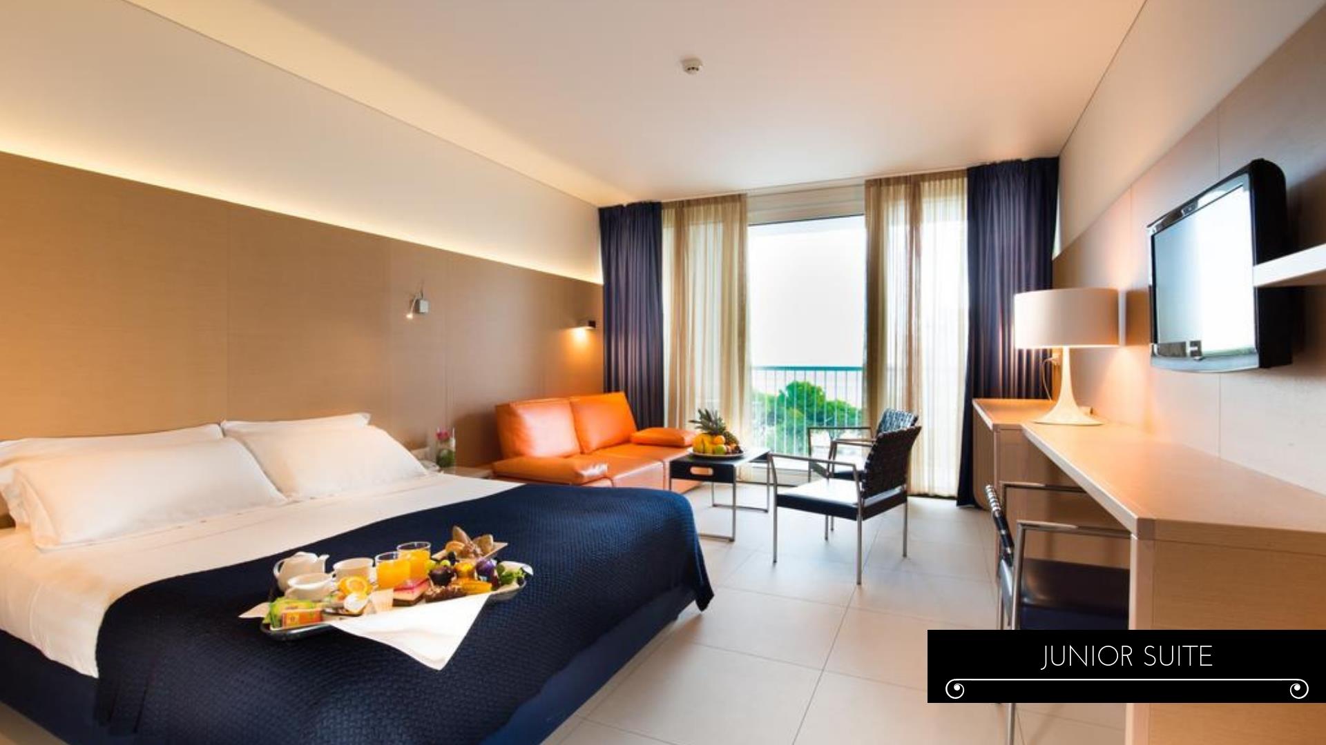 JUNIOR SUITE DELUXE VISTA MARE FRONTALE max occupancy 2 pax (26 mq): letto matrimoniale, un piccolo angolo soggiorno, un bagno con ampio box doccia, Televisore Lcd-Sat, telefono, balcone, cassaforte, aria condizionata, minibar con bevande a pagamento, WiFi.