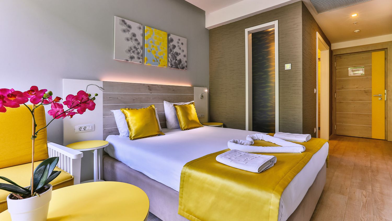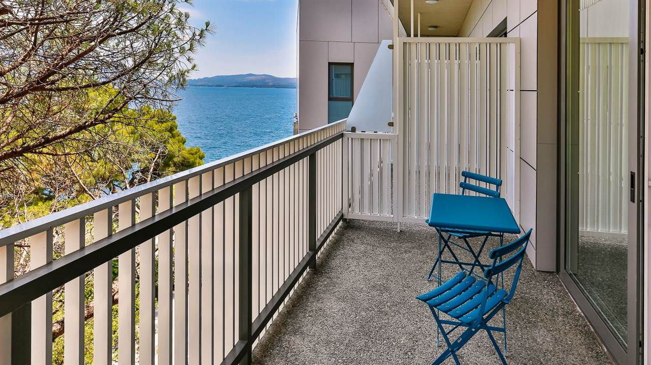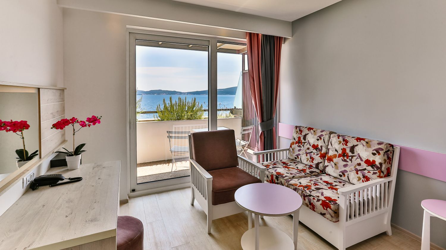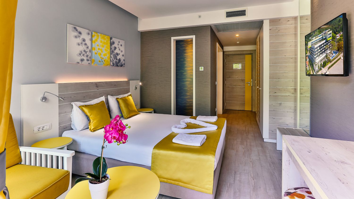 L'hotel dispone di 282 camere confortevoli e prestigiose. Tutte le camere sono climatizzate e dotate di bagno privato, elegante soggiorno, telefono con linea diretta, Wi-Fi, TV satellitare, cassaforte e minibar. Un'atmosfera speciale è creata dalle ampie terrazze, dalle quali si può godere di una vista indimenticabile sulla baia o sulle cime delle montagne circostanti, e respirare la freschezza e i profumi delle erbe di montagna. Camera matrimoniale con vista montagna: letto matrimoniale (160x200 cm) o due letti singoli (90x200 cm), bagno con doccia, asciugacapelli, aria condizionata, telefono, TV satellitare, Wi-Fi, mini frigo, cassaforte, terrazza con tavolo e sedia. 22 mq, disponibile su tutti i piani. Camera matrimoniale con vista laterale sul mare: letto matrimoniale (160x200 cm) o due letti singoli (90x200 cm) e divano letto, bagno con doccia, asciugacapelli, aria condizionata, telefono, TV satellitare, Wi-Fi, mini frigo, cassaforte, terrazza con tavolo e sedia. 28,50 mq, situata dal 1° al 6° piano. Camera matrimoniale con vista mare: letto matrimoniale (180x200 cm) o due letti singoli (90x200 cm) e divano letto, bagno con doccia, asciugacapelli, aria condizionata, telefono, TV satellitare, Wi-Fi, mini frigo, cassaforte, terrazza con tavolo e sedia. 28,50 mq, situata tra il 1° e il 2° piano. Camera matrimoniale con vista mare, posizione privilegiata: letto matrimoniale (180x200 cm) o due letti singoli (90x200 cm) e divano letto, bagno con doccia, asciugacapelli, aria condizionata, telefono, TV satellitare, Wi-Fi, mini frigo, cassaforte, terrazza con tavolo e sedia. 28,50 mq, situata al 3° e 4° piano. Camera familiare: letto matrimoniale (160x200 cm) e letto a castello, bagno con doccia, asciugacapelli, aria condizionata, telefono, TV satellitare, Wi-Fi, mini frigo, cassaforte, terrazza con tavolo e sedia. 28,50 mq, situata al 1° o 2° piano, con vista sull'atrio. Camera familiare con vista laterale sul mare: letto matrimoniale (160x200 cm) e divano letto trasformabile in letto a castello, bagno con doccia, asciugacapelli, aria condizionata, telefono, TV satellitare, Wi-Fi, mini frigo, cassaforte, terrazza con tavolo e sedie. 43 mq, situata dal 1° al 6° piano.Spiaggia