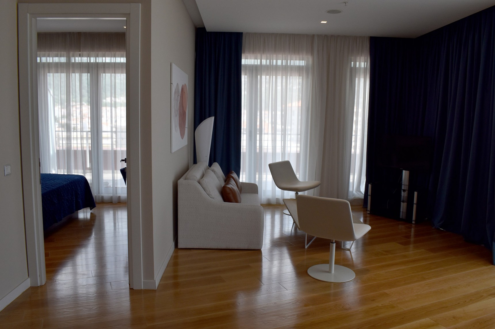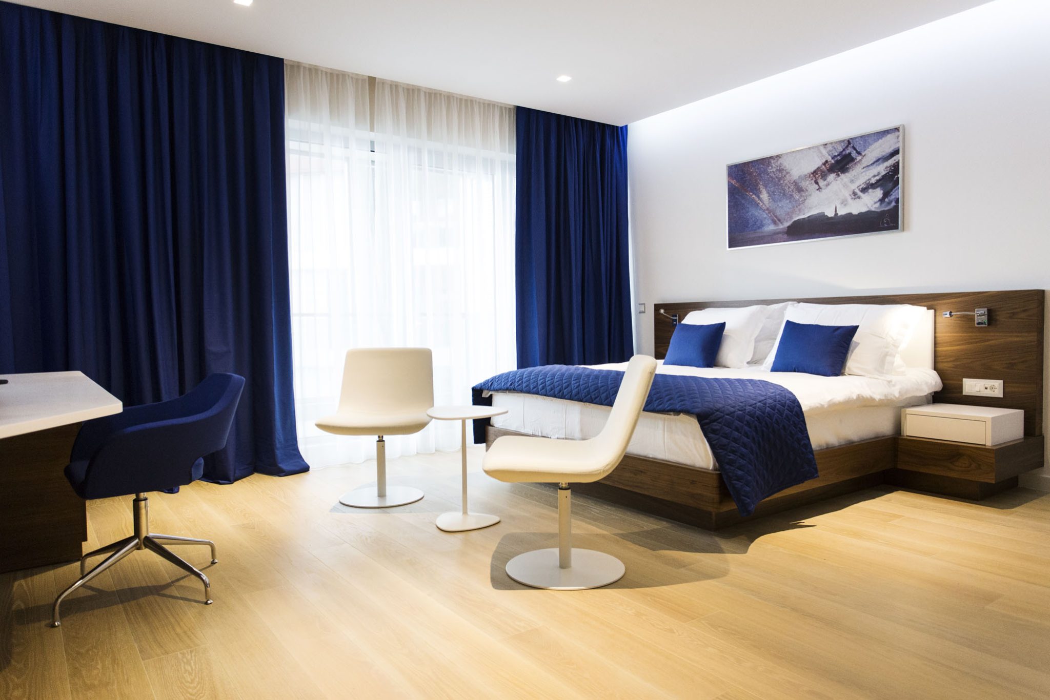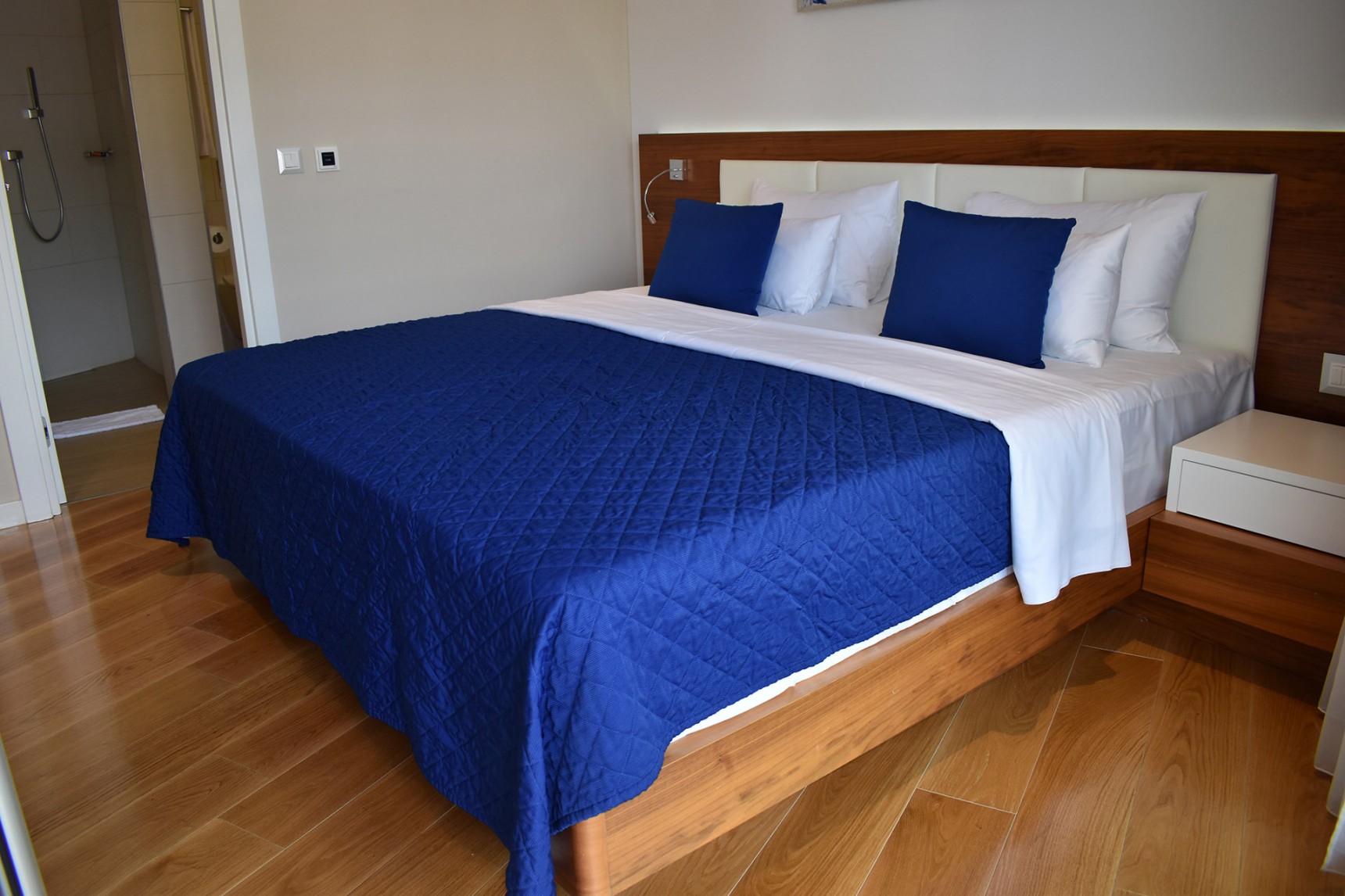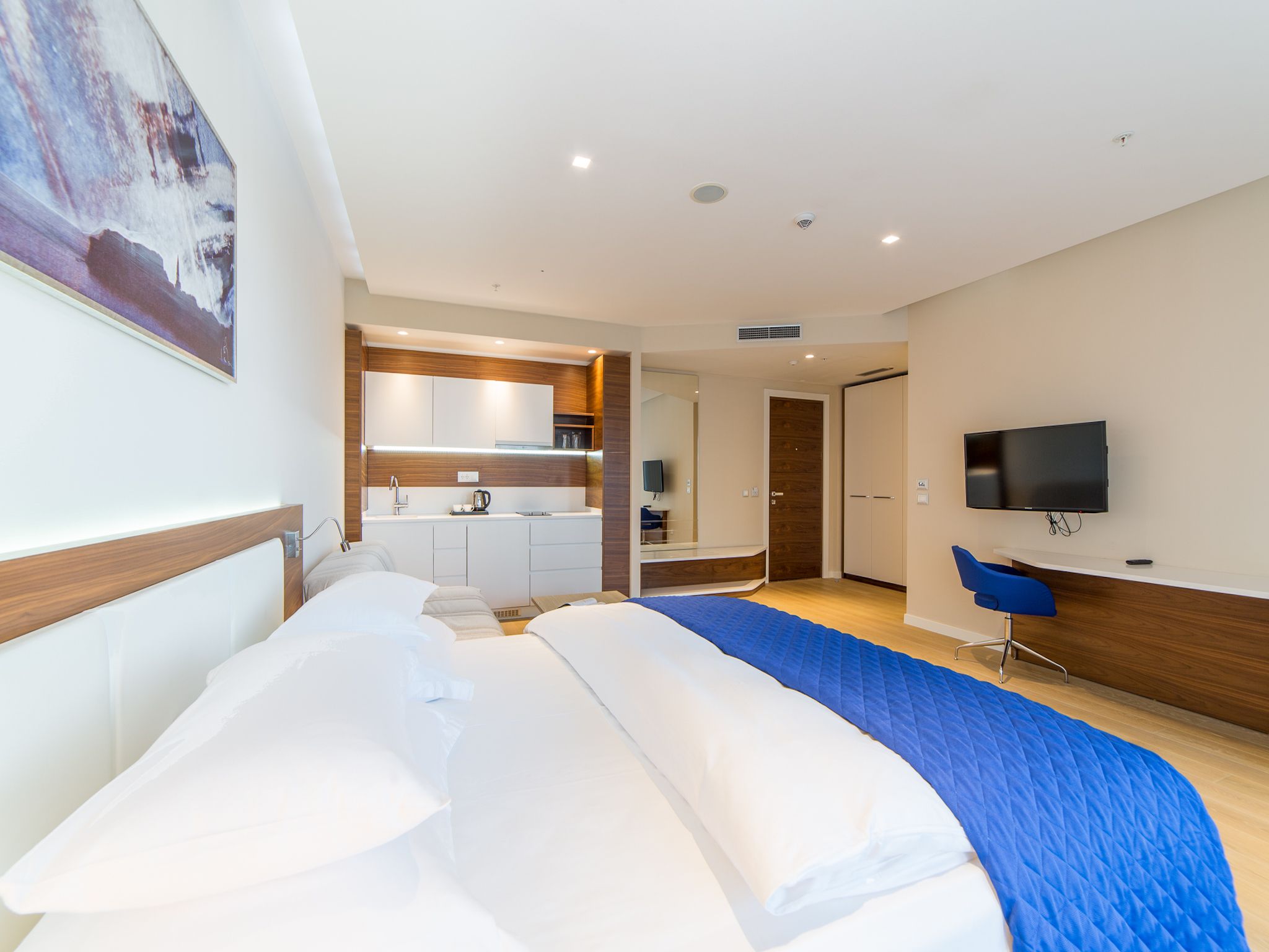 La struttura dell'hotel comprende 74 camere spaziose e ben attrezzate, di diverse categorie. Camera doppia con letti singoli: due letti singoli, bagno (box doccia, asciugacapelli, accappatoio, pantofole, articoli da toeletta), aria condizionata, TV satellitare, Wi-Fi, set per la preparazione di tè e caffè, cassaforte, balcone. Vista sulla città, 36 mq. Camera Standard: letto matrimoniale o due letti singoli, bagno (box doccia, asciugacapelli, accappatoio, pantofole, articoli da toeletta), aria condizionata, TV satellitare, Wi-Fi, set per la preparazione di tè e caffè, cassaforte, balcone. Vista città o mare, 28-46 mq. Camera Superior: letto matrimoniale, bagno (box doccia, asciugacapelli, accappatoio, pantofole, prodotti da bagno), aria condizionata, TV satellitare, Wi-Fi, set per la preparazione di tè e caffè, cassaforte, balcone. Vista città o mare, 30-46 mq. Junior Suite: letto matrimoniale e divano letto matrimoniale, angolo cottura, bagno (box doccia, asciugacapelli, accappatoio, pantofole, prodotti da bagno), aria condizionata, TV satellitare, Wi-Fi, set per la preparazione di tè e caffè, cassaforte, balcone. Vista città o mare, 45-66 mq. Suite Deluxe: letto matrimoniale, zona giorno con divano letto matrimoniale, angolo cottura, bagno (box doccia, asciugacapelli, accappatoio, pantofole, set di cortesia), aria condizionata, TV satellitare, Wi-Fi, set per la preparazione di tè e caffè, cassaforte, terrazza. Vista montagna o mare, 65-114 mq. Penthouse: soggiorno separato con divano (che si trasforma in un letto di 160x200 cm), 2 camere da letto con 1 letto matrimoniale ciascuna, 3 bagni (box doccia, asciugacapelli), aria condizionata, TV satellitare, Wi-Fi, set per la preparazione di tè e caffè, cassaforte, grande terrazza con jacuzzi. Vista mare, 90 mq + terrazza di 140 mq.Amici a 4 Zampe