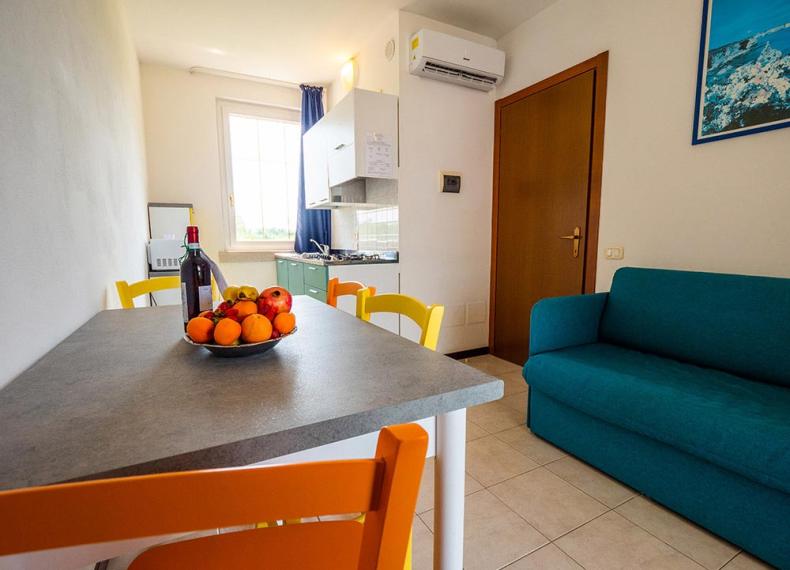 TRI, Trilocale piano terra (massimo 6 persone). Appartamento al piano terra con camera matrimoniali, camera doppia con due letti separati e divano letto matrimoniale in soggiorno. Angolo cottura con fornello a gas, 4 fuochi, lavello e frigo con scomparto ghiaccio, tavolo e sedie. Aria condizionata, TV Sat 32°, terrazza arredata cpn tavolo e sedie da giardino e de lettini prendisole.