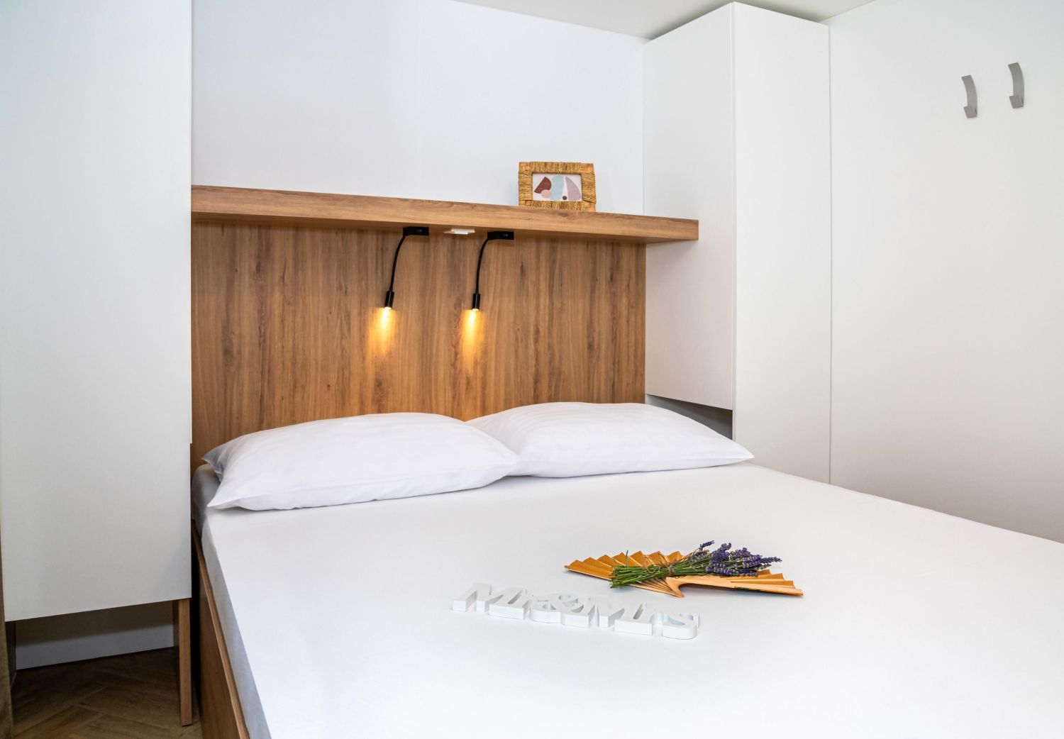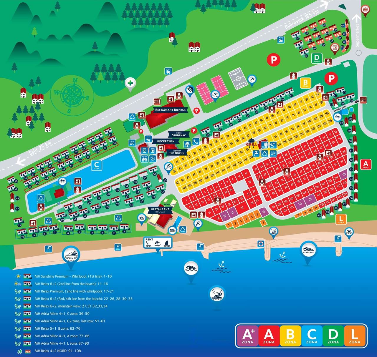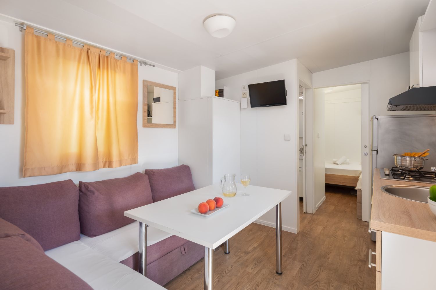 Mobilhome Relax 4+2: 2 camere da letto, cucina (piano cottura, frigorifero, macchina per il caffè, utensili da cucina), soggiorno (soggiorno (l'angolo del soggiorno può essere convertito in un letto aggiuntivo per due persone), bagno, terrazza coperta con mobili da esterno. Le mobilhome sono dotate di aria condizionata e TV satellitare. Mobilhome Relax 5+1: 3 camere da letto, cucina moderna (lavastoviglie, piano cottura a gas, forno a microonde, frigorifero, macchina per il caffè, bollitore, ferro da stiro, asse da stiro e stoviglie), soggiorno (divano a due posti nel soggiorno può essere convertito in un letto aggiuntivo per una persona), 2 bagni con pavimento e pareti piastrellati, termosifone, terrazza coperta. Le mobilhome sono dotate di aria condizionata e TV satellitare. Mobilhome Relax 6+2: 3 camere da letto, cucina moderna (lavastoviglie, piano cottura in vetroceramica, forno a microonde, frigorifero e utensili da cucina), soggiorno (l'angolo del soggiorno può essere convertito in un letto aggiuntivo per 2 persone), 2 bagni con pavimento e pareti in piastrelle di ceramica, terrazza coperta. Le case mobili sono dotate di aria condizionata e TV satellitare. Mobilhome Adria Superior 4+1: 2 camere da letto (una camera con letto matrimoniale da 160x200 cm; l'altra camera con due letti singoli da 80x200 cm), cucina moderna completamente attrezzata (piano cottura a gas su piattaforma in vetroceramica con 4 fuochi, cappa aspirante integrata, lavello in acciaio inox con scolapiatti, frigorifero indipendente con congelatore e utensili da cucina), soggiorno (divano adatto per un bambino, set da pranzo), 2 bagni (doccia, WC, lavandino). Le case mobili sono dotate di aria condizionata e TV satellitare.Spiaggia