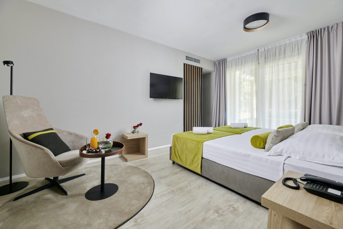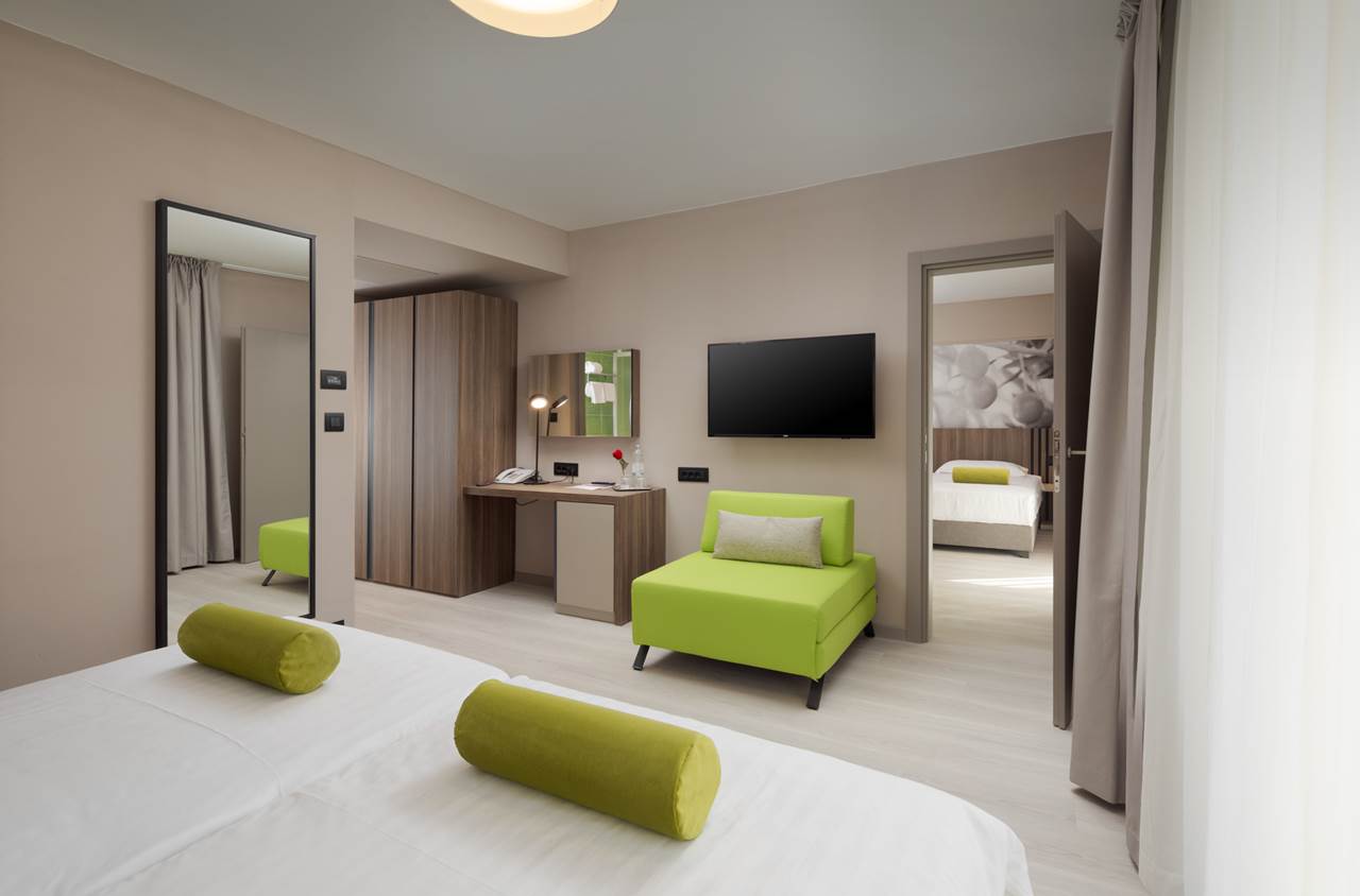 Residence Garden Istra offre camere a 4 stelle moderne, pensate per le famiglie che cercano comfort, spazio e un’atmosfera rilassata. Situata accanto al completamente rinnovato Hotel Garden Istra, permette un soggiorno tranquillo con pieno accesso a tutti i servizi aggiornati e alle attività per famiglie dell’edificio principale. Gli ospiti possono godere di ristoranti rinnovati, un vivace work & play lobby, colorati parchi giochi, trampolini, campi sportivi polivalenti, piscine interne ed esterne e un parco acquatico interattivo per un divertimento familiare senza fine. I kids’ club per diverse fasce d’età stimolano creatività e socializzazione, mentre le aree dedicate al riposo e al sonnellino permettono ai genitori di rilassarsi. Lo staff di animazione organizza giochi, laboratori creativi, sfide sportive e intrattenimento serale per bambini e adulti. Le famiglie attive possono esplorare percorsi ciclabili panoramici in Istria, taverne locali o partecipare a visite guidate, mentre la spiaggia, a soli 300 metri lungo un profumato sentiero tra i pini, è perfetta per momenti di sole in famiglia. Gli amanti dello sport possono usufruire di campi da tennis, palestra completamente attrezzata, programmi sportivi giornalieri con allenatori professionisti e centro benessere con sauna e idromassaggio. Residence Garden Istra e il completamente rinnovato Hotel Garden Istra offrono la combinazione perfetta di risate dei bambini, relax dei genitori e ricordi indimenticabili in famiglia — la base ideale per una vacanza in famiglia a Umago.Sistemazioni