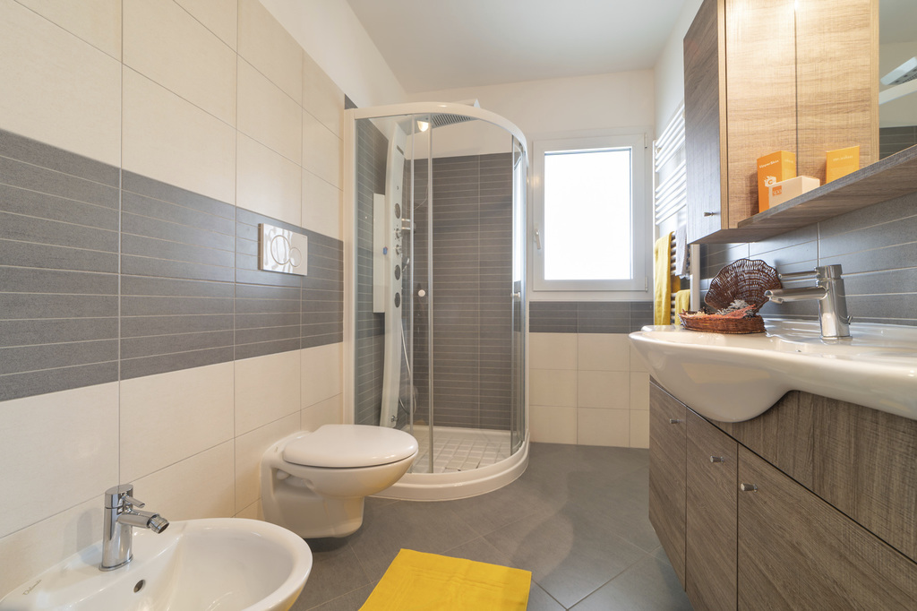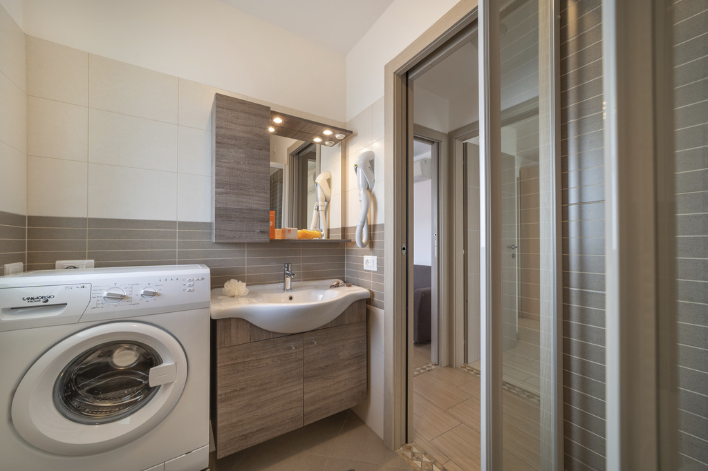Introduzione: Elegante e moderna palazzina di nuova costruzione a 450 m dalla spiaggia e a pochi passi dal centro pedonale di Lignano Sabbiadoro. CARATTERISTICHE: dispone di ascensore e parcheggio gratuito garantito (altezza 224 cm, larghezza 218 cm).APPARTAMENTI: tutti modernamente arredati, dispongono di aria condizionata, balcone attrezzato, Wi-Fi, TV Sat, lavatrice, lavastoviglie, forno a microonde, cassetta di sicurezza, servizi privati con box doccia e asciugacapelli. TRILO C6: soggiorno con angolo cottura e divano letto doppio, camera matrimoniale e camera doppia.SERVIZI: Wi-Fi free. Servizio spiaggia incluso (1 ombrellone + 2 lettini ad appartamento).