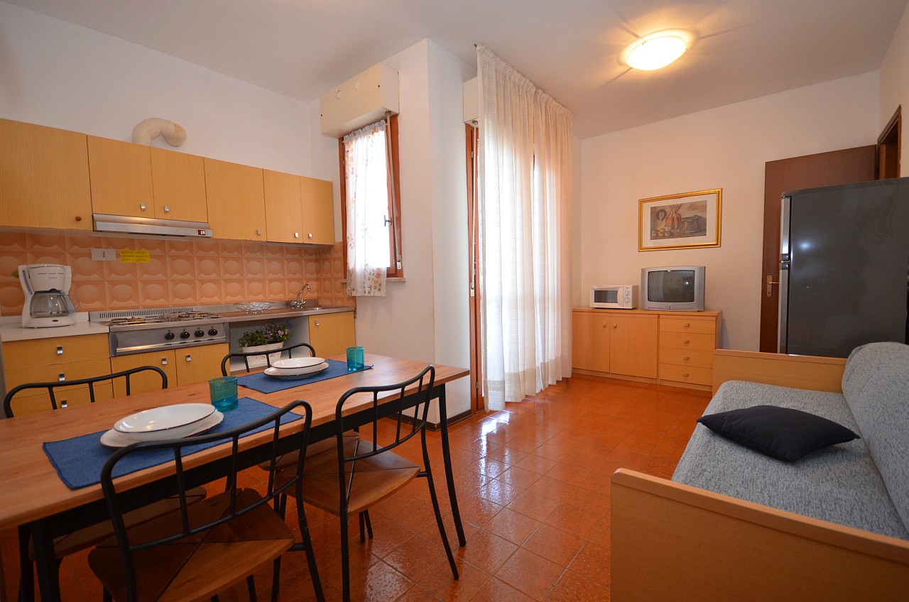 - Bilocale Tipo B (35 mq - occupazione minima 1 adulto, occupazione massima 4 adulti) composto da soggiorno con divano letto doppio, 1 camera con letto matrimoniale, angolo cottura, bagno, terrazzo, aria condizionata.