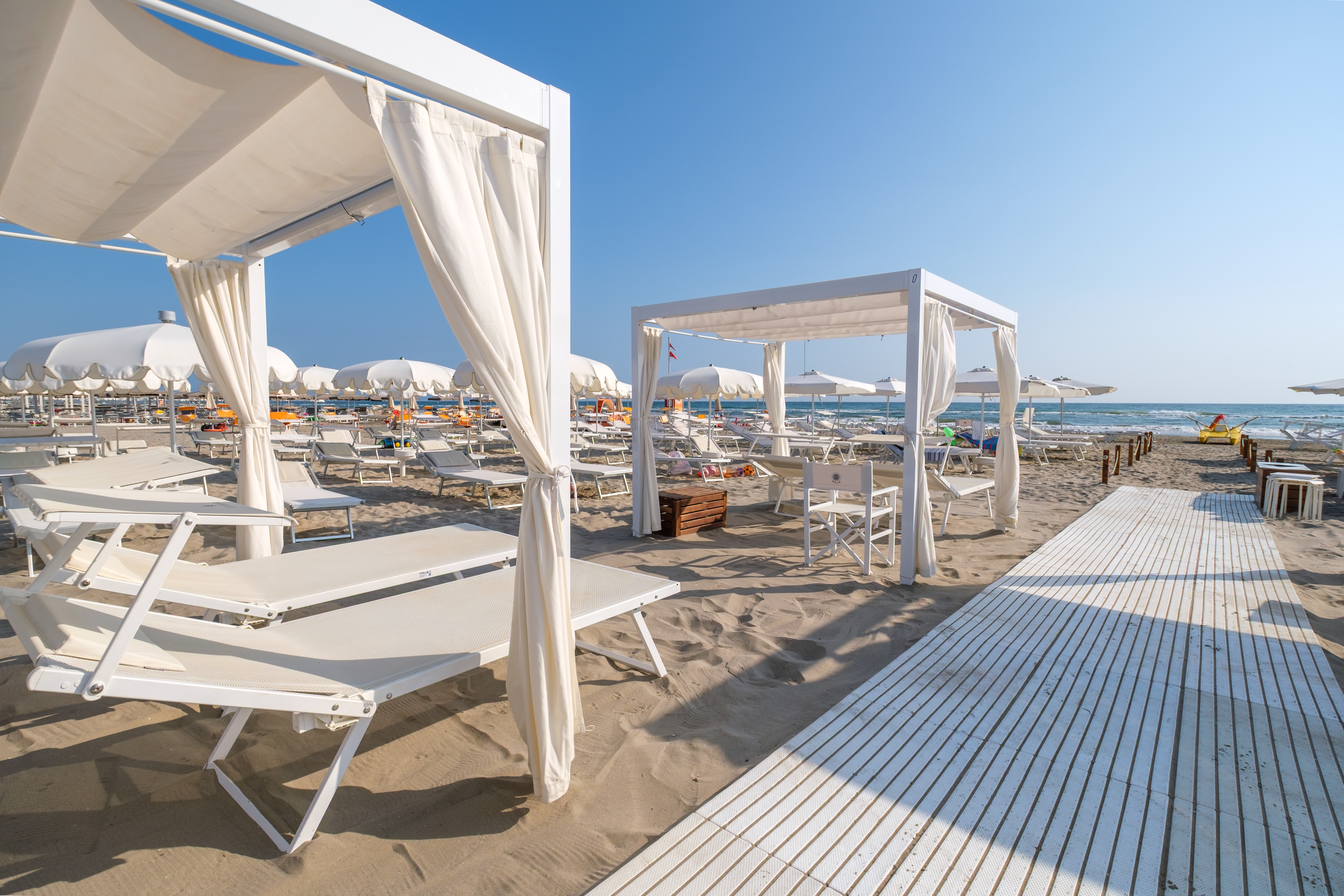 La spiaggia di sabbia dista circa 350 metri dalla struttura. Il servizio spiaggia è incluso e comprende 1 ombrellone e 2 lettini a camera.