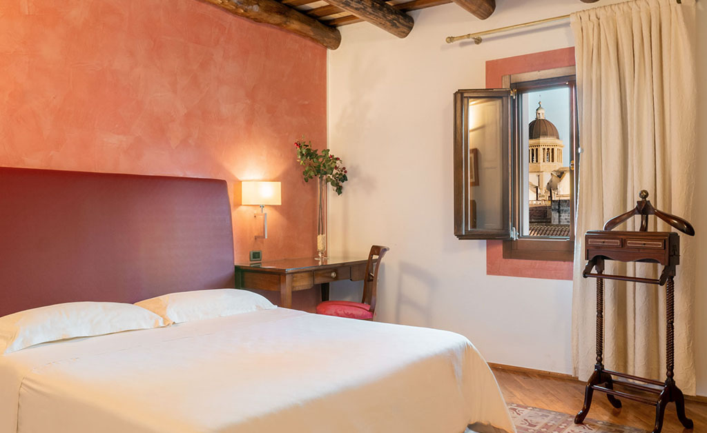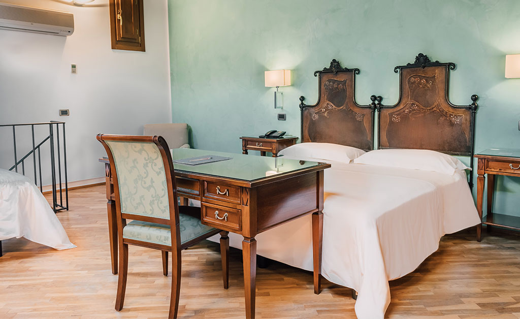 La nostra junior suite, arredata e decorata in autentico stile siciliano, ampia e luminosa, con travi a vista. Bagno con vasca idromassaggio. Le nostre camere affacciano sul silenzioso cortile interno dell’edificio, sulla tranquilla Piazza del Carmine o sul Giardino dell’Hotel.