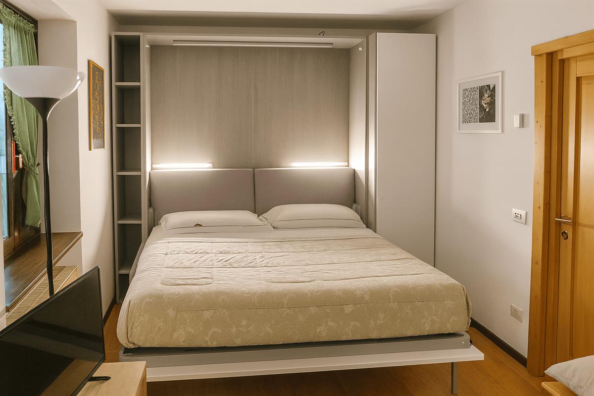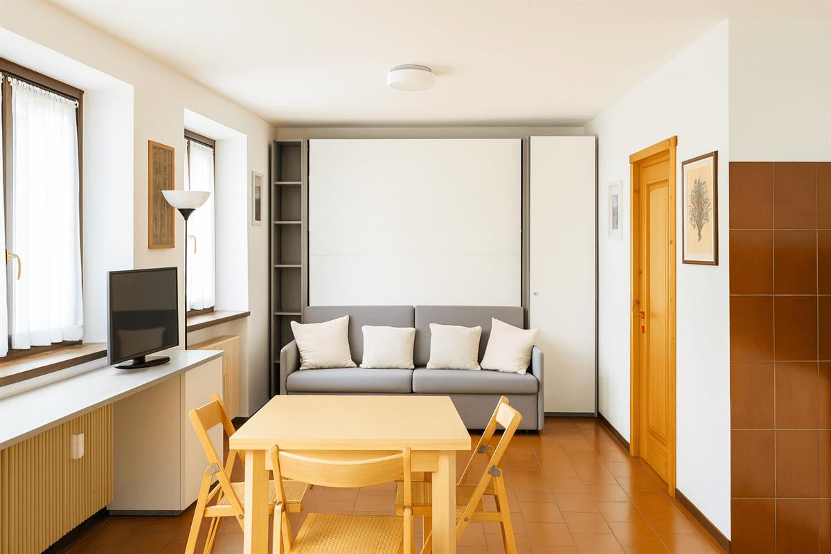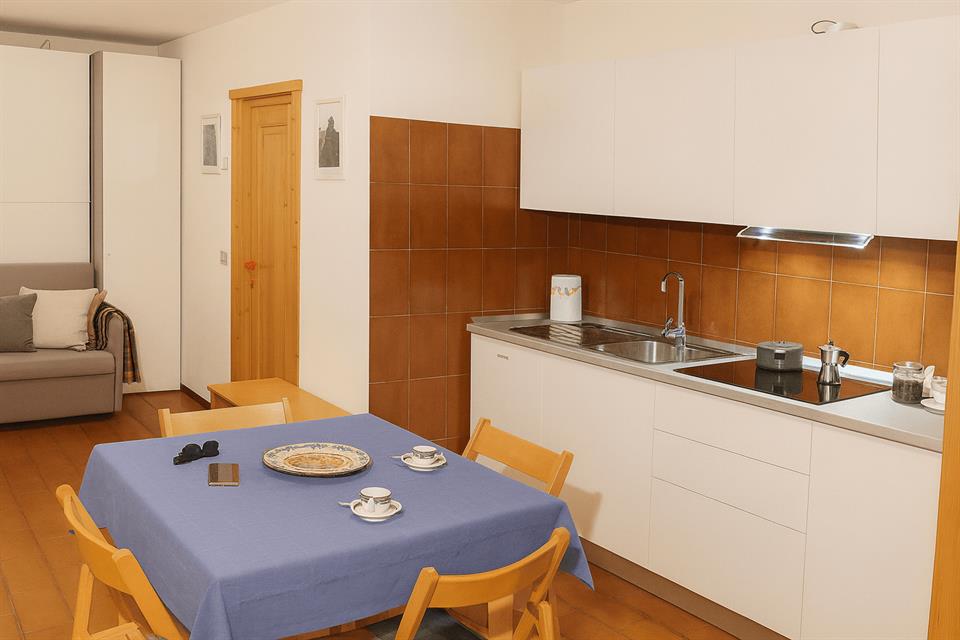 Struttura piccola ma studiata nei dettagli dell'arredo per essere vissuta. E' collocata nelle vicinanze della via principale di Chiesa al piano rialzato di un edificio residenziale con vista sul pizzo Scalino. La posizione è tranquilla e riservata. Possibilità di parcheggio nelle adiacenze. Sono presenti la cucina/soggiorno, il bagno con doccia ed un balcone. L'area giorno è adibita anche ad area notte con il semplice abbassamento di letti a scomparsa.