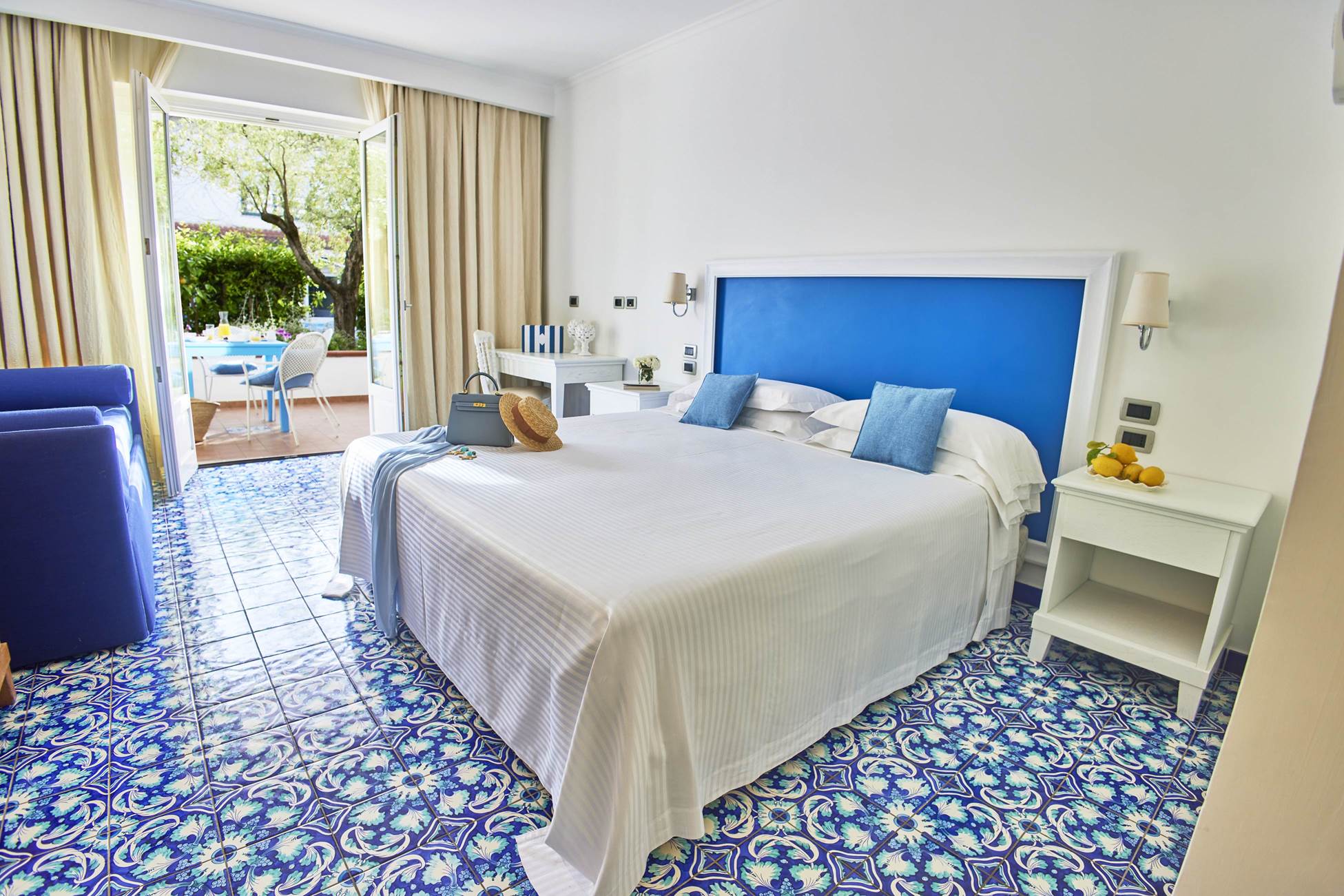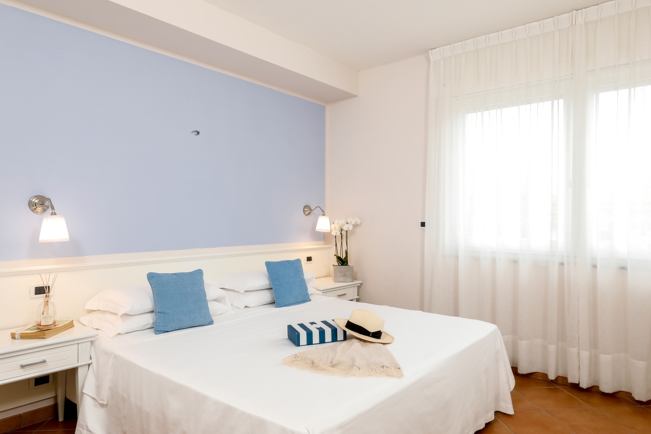 La struttura dispone di Camere, Suite e Appartamenti dislocati nel parco nel resort, per soddisfare tutte le richieste.Ogni sistemazione è dotata di cassaforte, wifi gratuito, doppio cuscino e coperta, phon, kit di cortesia, asciugamani, minibar e aria condizionata. La pulizia è giornaliera per tutte le sistemazioni, con cambio delle lenzuola due volte alla settimana. La nostra offerta prevede le seguenti tipologie di camere:Camera Deluxe: ampia e confortevole, la camera Deluxe è situata nel parco, nella parte più tranquilla del Resort, circondata dagli ulivi che ne delineano il panorama. Finemente arredata nel classico stile Mediterraneo, dispone di un comodo letto matrimoniale Queen size e divano letto doppio. Bagno con vasca, nei colori della raffinata ceramica vietrese. Balconcino con tavolo e sedie. Disponibili al piano terra e primo piano senza ascensore. Camera Superior: ampia e confortevole, la camera Superior è ubicata nel corpo centrale dell'hotel, vicinissima ai servizi. Elegantemente arredata e impreziosita con pavimento in ceramica vietrese o in cotto salernitano, è composta da letto matrimoniale Queen size, divano letto doppio, bagno con vasca e balconicno con tavolo e sedie. Disponibili anche al piano terra e primo piano con ascensore. Prestige Suite: la Prestige Suite è unica nel suo stile, impreziosita da arredi con manifattura artigianale, tessuti pregiati e materiali ricercati, per un effetto di sofisticata eleganza. Ubicata al piano terra nel Parco, rifinita in preziosa ceramica vietrese, è composta da una zona notte con letto matrimoniale Simmons King size (2x2) e letto singolo incorniciato da un'ampia vetrata; ampio bagno con doccia e luminosa zona living separabile con porta scorrevole e attrezzata con divano letto doppio Simmons e pario esterno ombreggiato con tavolo e sedie. Negli appartamenti, la cucina è attrezzata, ma a carico degli ospiti; infatti, il tovagliato non è presente (tovaglia, strofinacci, tovaglioli). No forno né microonde né lavatrice né lavastoviglie.Appartamento Family: bilocale più semplice negli arredi, l'appartamento Family è dislocato in villini a schiera a ridosso della piscina e dell'ampio parco. Ubicato al piano rialzato, è composto da una zona notte con letto matrimoniale e un letto singolo con vista sul parco; bagno con vasca e zona living attrezzata con angolo cottura, tavolo da pranzo e divano letto doppio. Ha ingresso indipendente e dispone di terrazzino con tavolo e sedie. Appartamento Elegance: bilocale finemente arredato, l'appartamento Elegance è dislocato in villini a schiera a ridosso della piscina e dell'ampio parco. Si compone di una zona giorno con angolo cottura a scomparsa e divano letto doppio, una zona notte con letto matrimoniale e un letto singolo, e di un bagno con vasca. Tutti gli appartamenti hanno ingresso indipendente e sono al piano rialzato.Spiaggia
