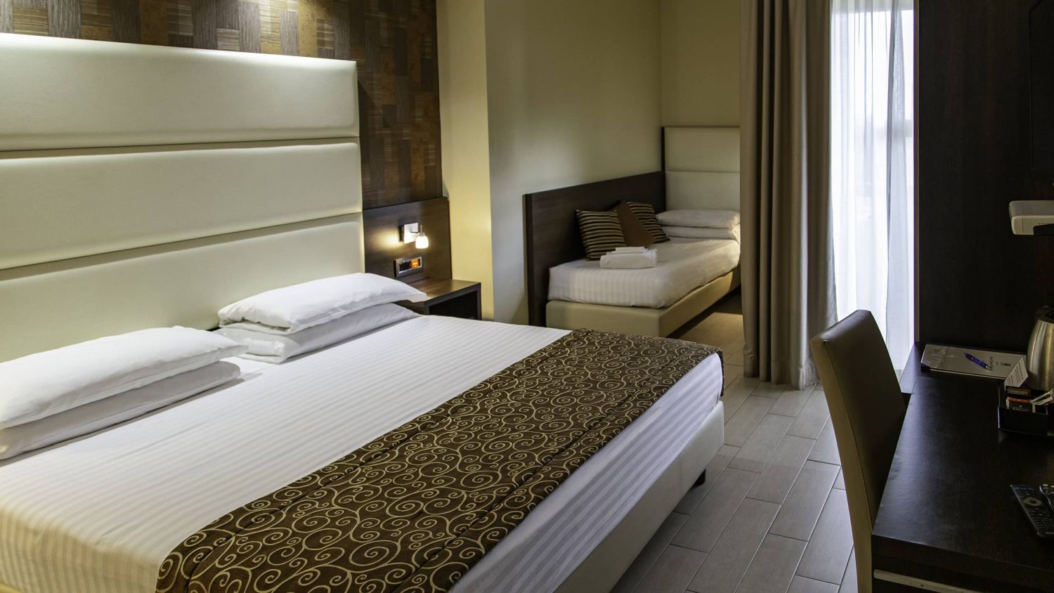 Il nostro Hotel vi offre differenti tipologie di camere per ogni esigenza: dalle nuove Comfort e Comfort Premium appena rinnovate con un look moderno e dai colori rilassanti, fino al settimo piano, l'Executive Floor “The Seventh Heaven”, con Superior e Suites dagli ambienti classici e raffinati per un livello di comfort superiore ed esclusivo. Ognuno di voi potrà scegliere in base al proprio budget e necessità la camera più adatta a sé. E' comunque sempre inclusa la proverbiale gentilezza del nostro staff che renderà il vostro soggiorno una piacevole scoperta! Comfort Rooms: sono le nostre nuove camere, totalmente rinnovate in stile moderno e piacevolmente arredate nei toni chiari e pastello, sono insonorizzate e dotate di tutti i comfort di categoria. 20 mq circa più balcone. Comfort Premium Rooms: sono le nuove camere totalmente rinnovate in stile moderno ed elegante, situate al sesto piano della struttura con una piacevole vista sulla città (alcune affacciano su uno splendido panorama dal quale è possibile vedere, tutta la città, la Cupola di San Pietro e sullo sfondo la bellissima cornice dei Castelli Romani). 20 mq circa più balcone. Camere Superior: sono le camere dell’elegante e raffinato settimo piano Executive. Arredate con mobili classici di pregio, hanno splendido bagno in marmo con doccia idromassaggio e sono dotate di balcone con piacevole vista sulla città (alcune affacciano su uno splendido panorama dal quale è possibile vedere, tutta la città, la Cupola di San Pietro e sullo sfondo la bellissima cornice dei Castelli Romani). 22 mq circa più balcone.Amici a 4 Zampe
