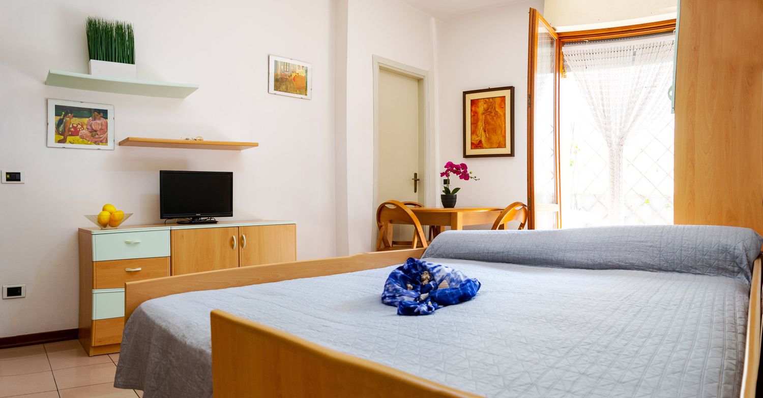 Gli appartameni bilocali per vacanze presso residenza Novalba Riccione sono moderni e confortevoli con Tv, balcone, lavatrice e aria condizionata. Bilocale: camera matrimoniale, salotto con divano letto, angolo cottura, bagno con box doccia, balcone.